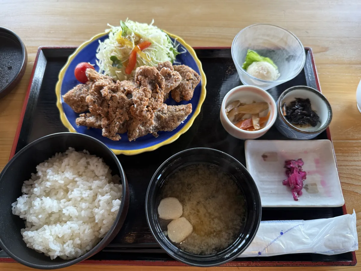 レストランが開店し、鯨の竜田揚げ定食を注文しいただきます🙏