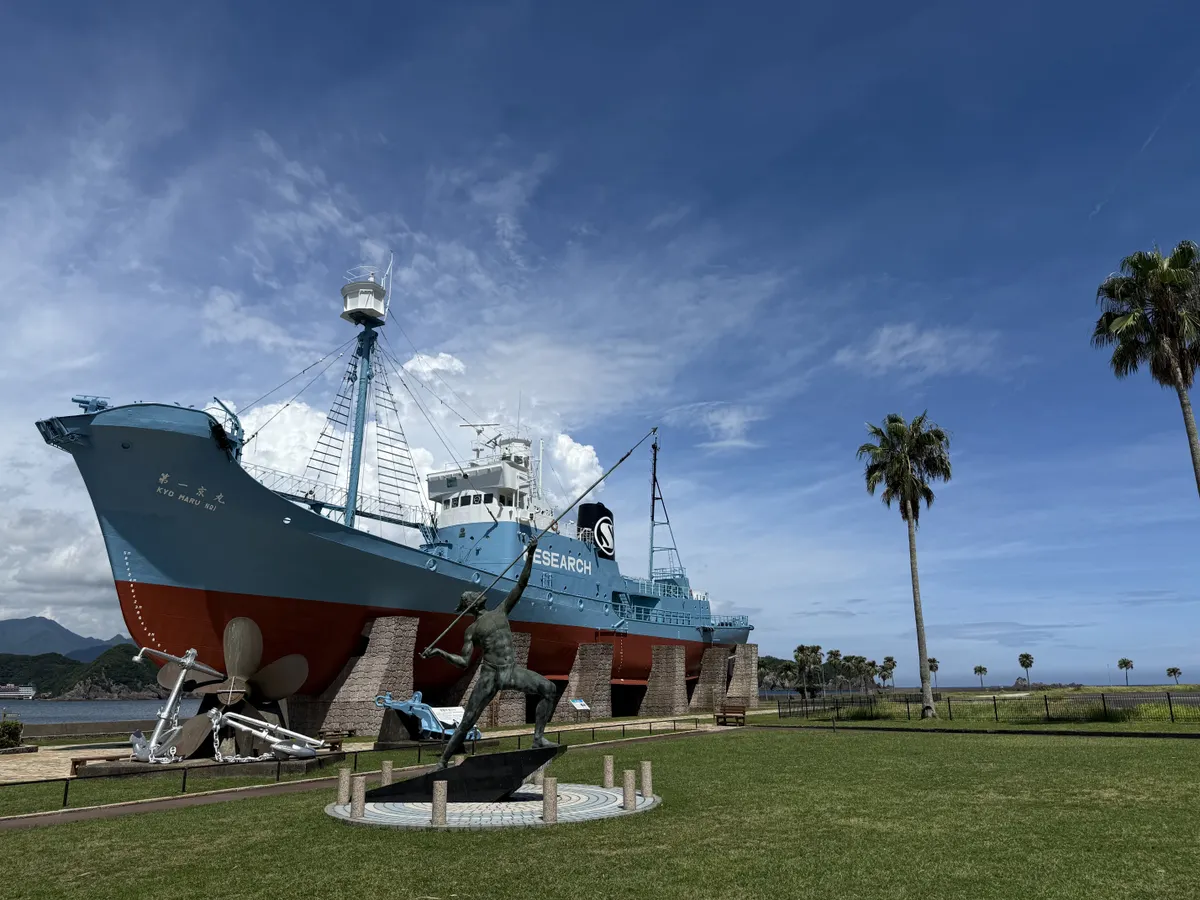 船の前の銅像は、昔のもりで突く漁師さんでしょうか。