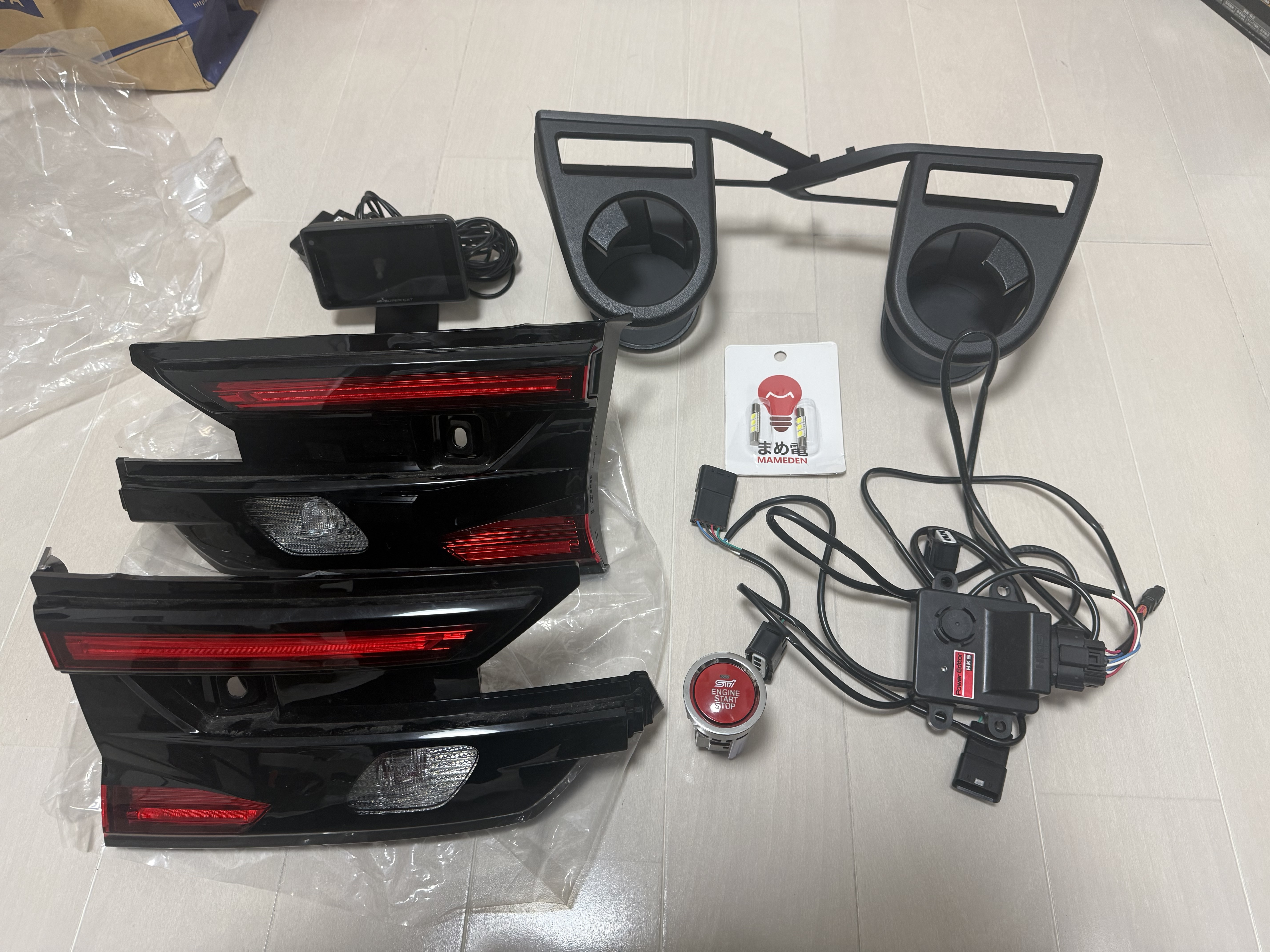 ユピテルレーダー探知機、運転席と助手席のドリンクホルダー、運転席と助手席のバニティランプ、LEDMATICSさんの純正加工LED増設テールランプ、AQUAさんのリバースランプ(組込み済み)、STIプッシュエンジンスイッチ、HKSさんのパワーエディター