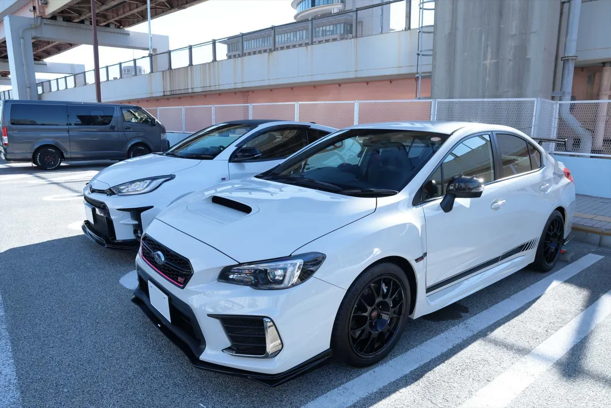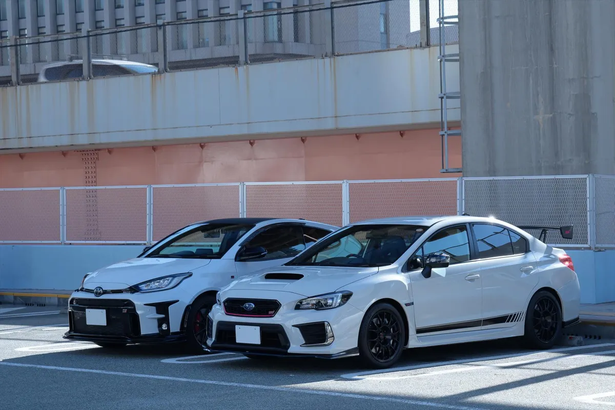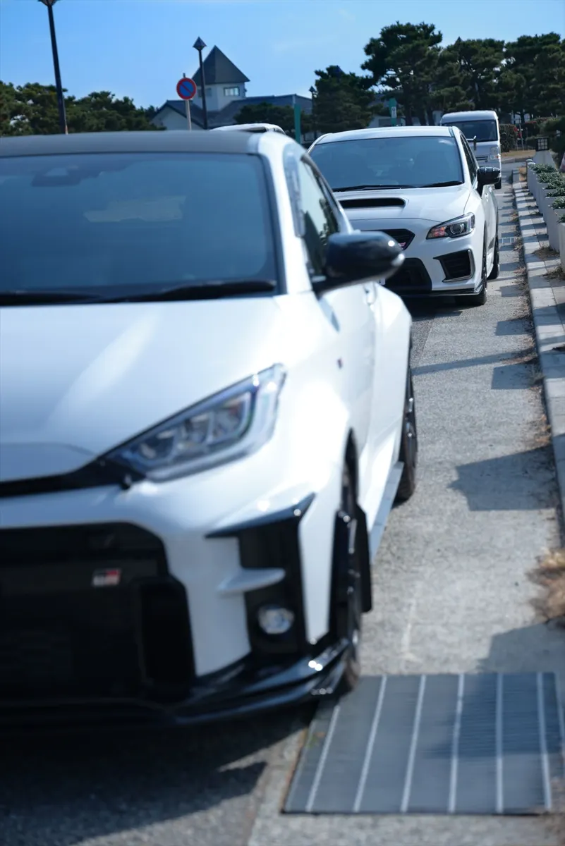 2. 早速愛車撮影。GRヤリスとWRXSTIが並ぶとまるで高速バトルが始まりそうですね。