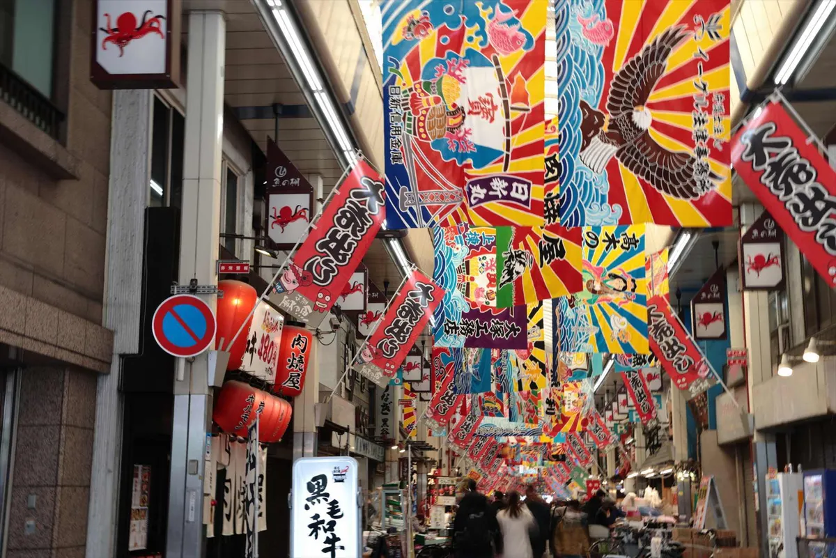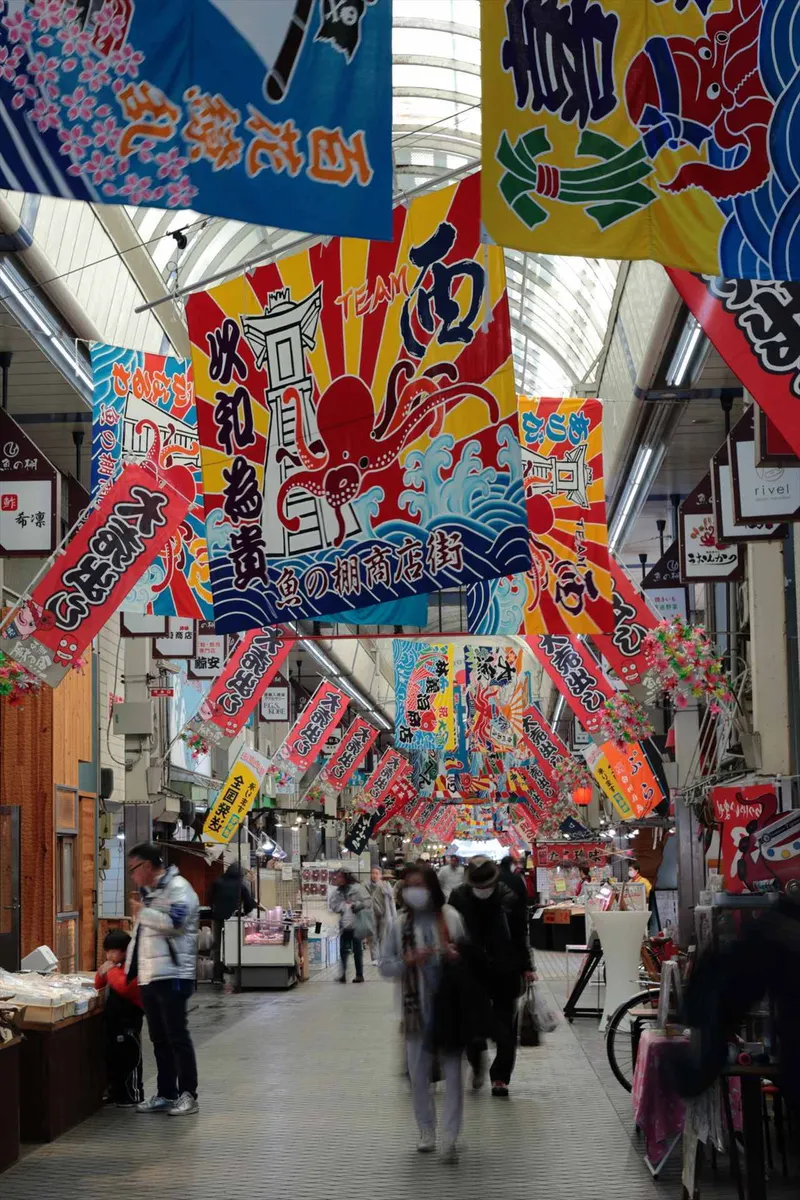 16. 食後は魚の棚(うおんたな)商店街をぶらぶら歩きます。魚の棚商店街は、明石の海産物や練りもの、乾物などを扱う商店を中心として約110の店舗が建ち並ぶ商店街。年末年始の恒例行事「大漁旗」の飾り付けが行われていました。