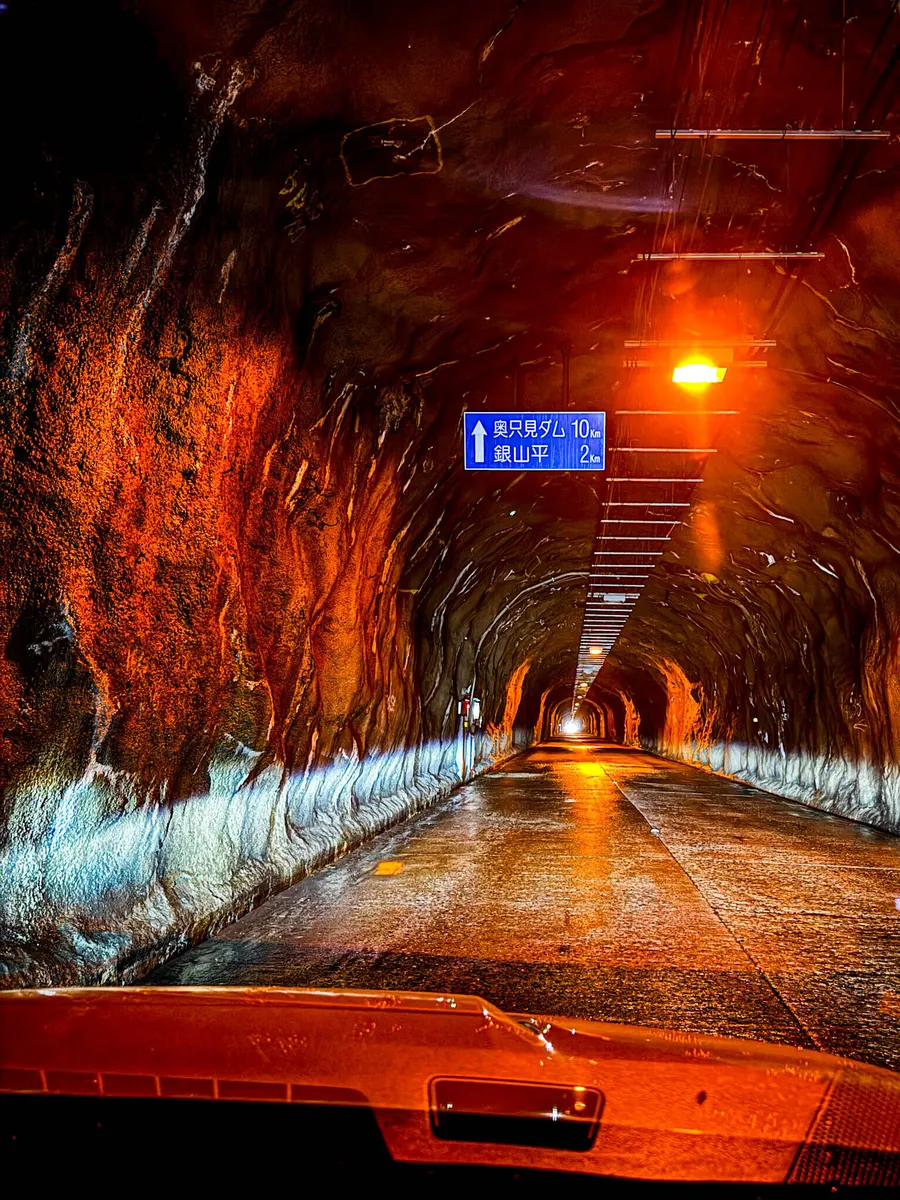 奥只見シルバーラインは奥只見ダムを作るために、その資材運搬専用道路として建設された道で、19のトンネルが続き、全長22kmのうち18kmがトンネルです。中にはトンネル壁面がゴツゴツした岩肌の箇所も多く、ずっと続く薄暗いトンネルを長く走ります。