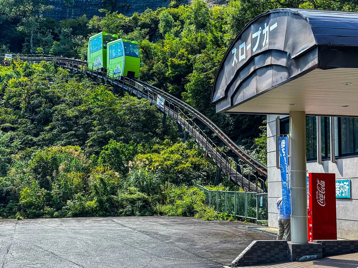 実はダム広場という展望スポットは駐車場から高い位置にある為、スロープカーが設置されています(片道200円)