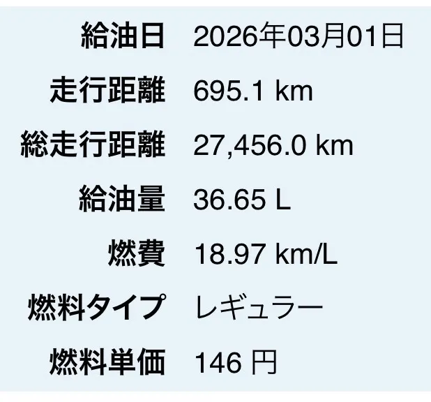 給油量は18.5リットルでしたので、満タン法での燃費は18.8km/Lと、燃費計とほぼ同じでした。