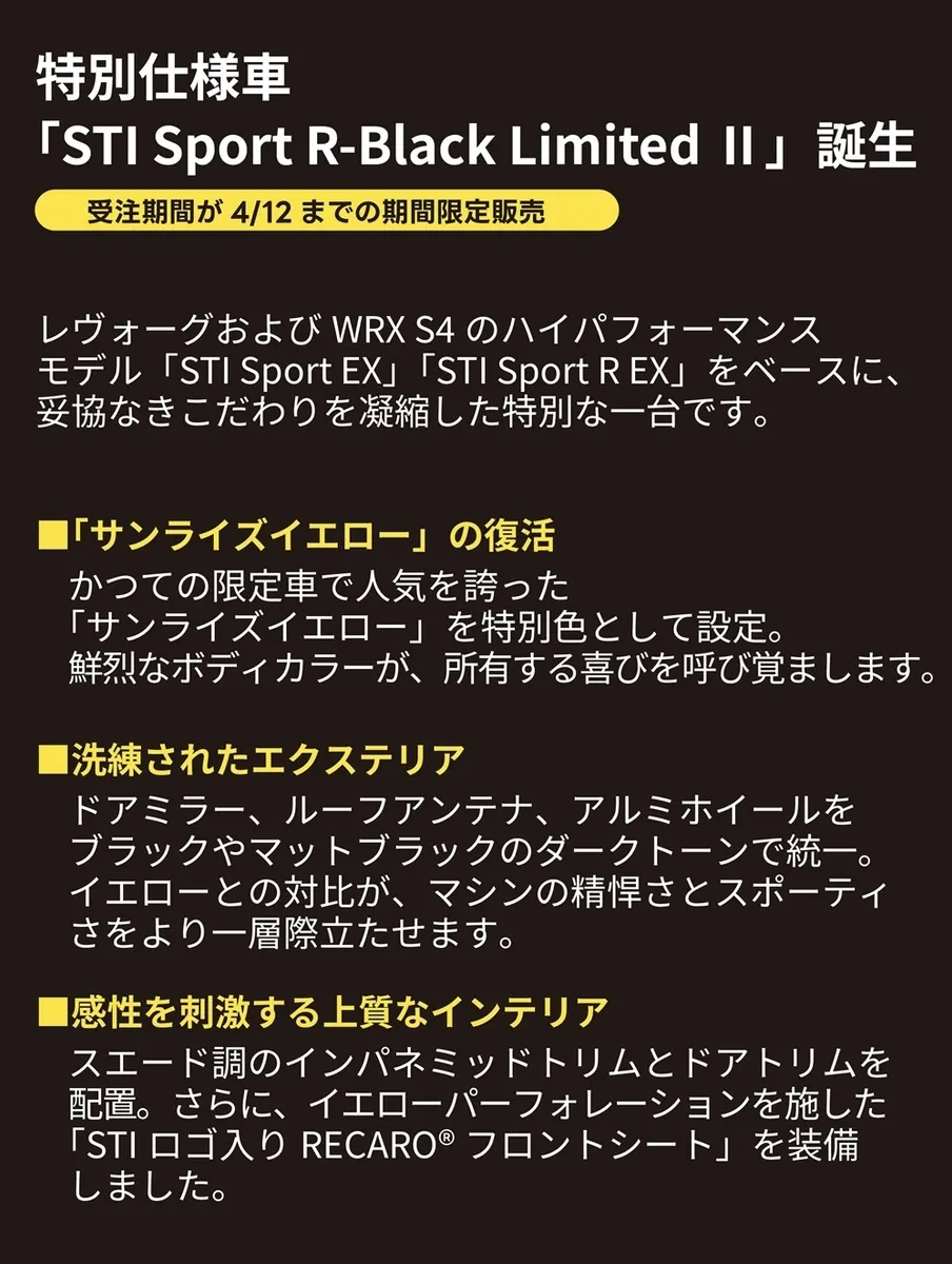 先日、静岡スバル公式のInstagramでレヴォーグとWRX S4のR-Black Limited Ⅱは受注期間が4/12までの期間限定販売であるということを見つけました‼️