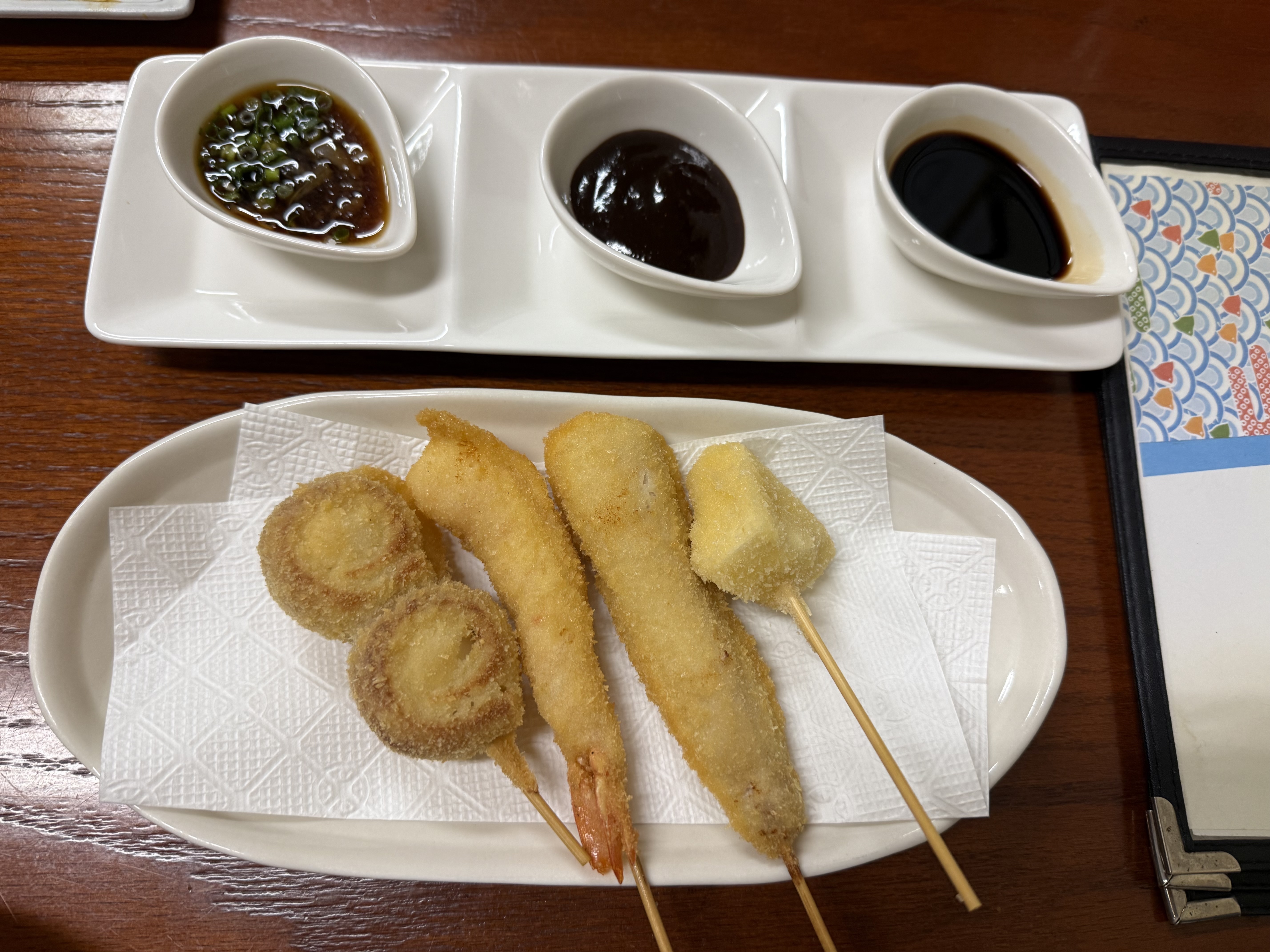 串揚げは左からうずら卵ちくわ、海老、豚巻きチーズ、カマンベールチーズです。