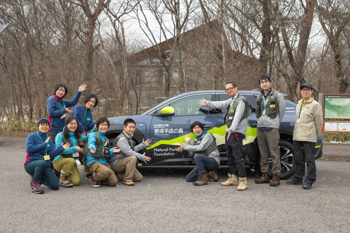 で、ガイドウォークや自然体験プログラムを通じて人々に自然からのメッセージを伝えるインタープリターの活動を支援するため、電気自動車「ソルテラ」を貸与しました。