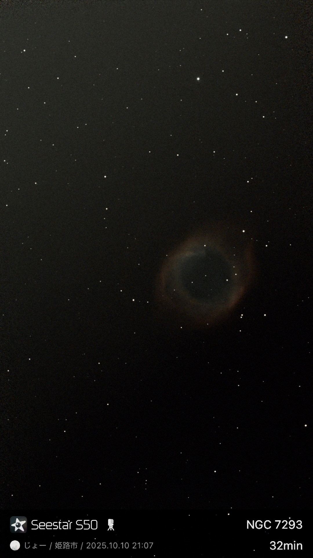 トップ > 星空部 > らせん星雲「神の目」撮影しました じょー 2025/10/10 23:13 らせん星雲「神の目」撮影しました 今晩は、よく晴れていましたので、南の空の水瓶座NGC7293を撮影してみました。目玉に見えるのか「神の目」と呼ばれましたが、恒星が寿命を迎えて白色矮星になってガスや塵を放出したものです。iPhone上でコントラスト調整しましたが、画像処理をPC上できちんとできれば、より際立つかも知れません。 らせん星雲 神の目 白色矮星 いいね 共有する 共有する X facebook LINE リンクをコピー コメントする 2 件の返信 (新着順) ミュートしたユーザーの投稿です。 投稿を表示 じょー 2025/10/11 10:56 画像補正ソフト「ステライメージ10」をお試しで使ってみました。 見やすくなったでしょうか?慣れない画像処理は難しいですね いいね 返信する ミュートしたユーザーの投稿です。 投稿を表示 ピコいちろう★ 2025/10/11 15:58 じょー こんにちは。神の目は、幻想的ですよね👁️ シースター上からの画像編集が若干できると聞いたのですが、それでも限界ありますかね💦 私も9/20伊豆でNGC7293撮影したものがあります。添付のがそれでして、コントラストは編集しています📝神の目はとても淡くて、何も編集しないとなかなか像が浮かび上がってきませんね💦 私は今度NGC246撮影しようと思っています。どくろ星雲です。 いいね 返信する ミュートしたユーザーの投稿です。 投稿を表示 じょー 2025/10/11 16:41 ピコいちろう★ シースター上で、画像編集はあまりしないのですが、コントラストとホワイトバランスの調整ぐらいだったかと思います。ガンマ値の調整が難しいです。 ところでシースター赤道儀モード用雲台届きました。明るい中、取り付けてみたのを後程、報告します。どくろ星雲も狙ってみたいです。 いいね 返信する ミュートしたユーザーの投稿です。 投稿を表示 ピコいちろう★ 2025/10/11 17:31 じょー おぉ〜良いですね⭐️雨が続きそうですので、赤道儀のイメージトレーニングがたくさんできそうですね✨ こちらは、10/25長野県川上村で星空観望を計画中です🌌天気が良いことを願っております🙏 いいね 返信する ミュートしたユーザーの投稿です。 投稿を表示 じょー 2025/10/11 18:10 ピコいちろう★ 10月25日晴れるといいですね。週間天気予報が出てきても、当日が良い天気なのか、曇り空なのか、やきもきします。日がすぐに沈み、夜長の楽しみです。満天の星々が迎えてくださりますように🌌 いいね 返信する ミュートしたユーザーの投稿です。 投稿を表示 hana☆ 2025/10/10 23:29 神の目、初めて知りました✨ じょーさんの所は晴れているのですね。 こちらは台風23号の雲が流れ込んできているのか、今は曇ってしまいました。 これから空気もカラッとしてくるので、星空がより一層キレイに見えますね。 いいね 返信する ミュートしたユーザーの投稿です。 投稿を表示 じょー 2025/10/11 09:50 hana☆ こんにちは 昨日の19時ごろ、ふと空を見上げたら、天頂付近に夏の大三角が見えましたので、南の空を見ることにしました。今日は、こちらも曇ってます。洗濯物に困ります🧺 そうですね、空気中の水蒸気が減ります。綺麗な星空観れるかわりに寒いです。 いいね 返信する