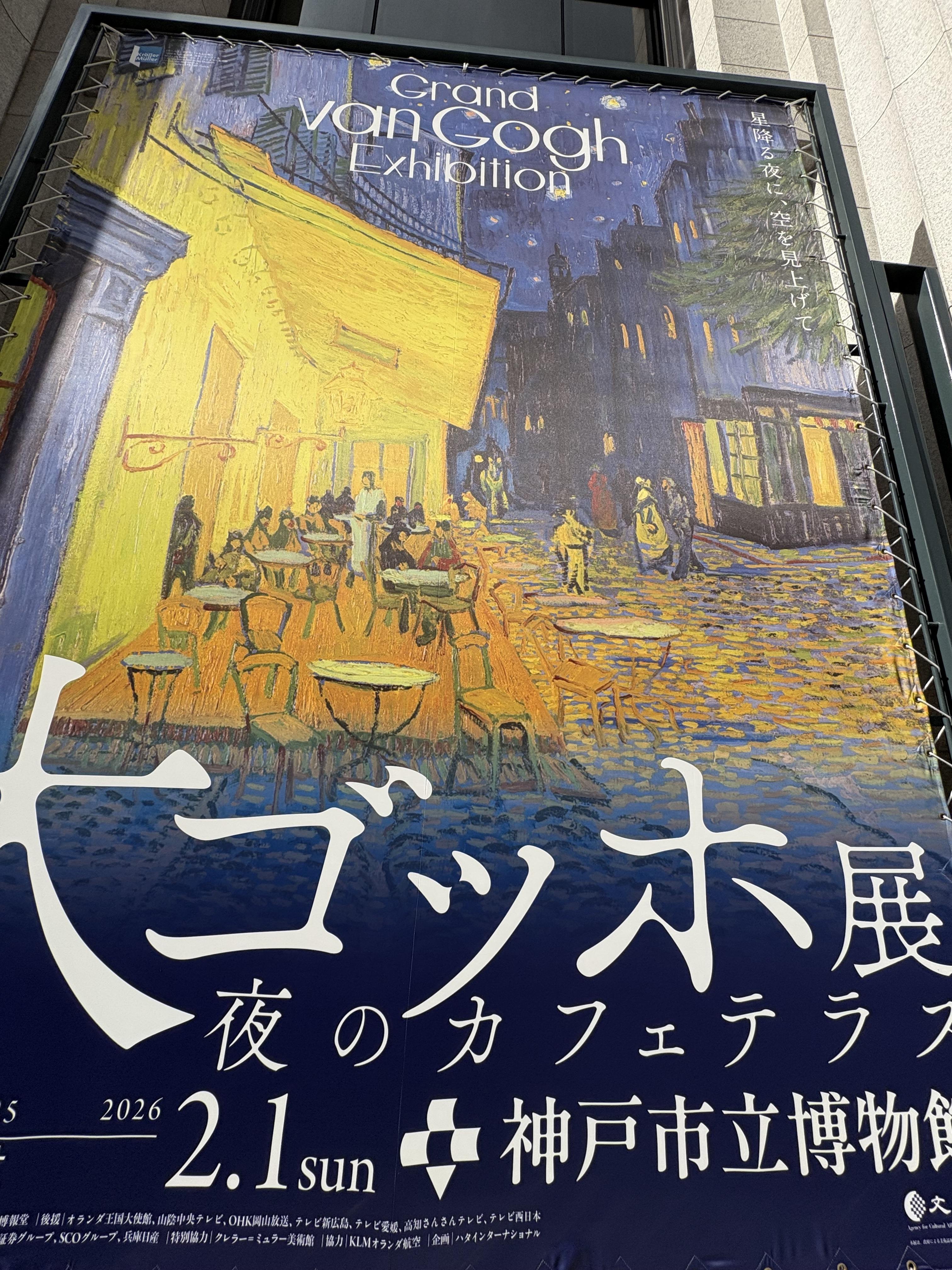 トップ > 星空部 > ゴッホと星空 じょー 2026/01/29 08:49 ゴッホと星空 今週末まで開かれている「大ゴッホ展」を神戸市立博物館で観てきました。ゴッホの描く星空といえば、糸杉の上で渦巻いている「星月夜」が有名ですが、今回のメインは「夜のカフェテラス」です。 ゴッホにとって夜は暗黒ではなく、群青で塗られ、星は黄色で大きく輝きます。この絵でも、ひまわりでも黄色は多く使われてますが、当時とても高価な絵の具で、金銭援助していた弟のティオも大変だったことでしょう。描かれたきらめく星々は、何座かわかりませんが、私は東の空か、いや北の空を描いたような気がします。 ゴッホ 夜のカフェテラス いいね 共有する 共有する X facebook LINE リンクをコピー コメントする 1 件の返信 (新着順) ミュートしたユーザーの投稿です。 投稿を表示 がー 2026/01/29 21:49 カフェテラスも額縁と壁を含めて景色ですね。 絵の評価が写実性以外の何かになっていく黎明期に模索していた人の一人ですよね。 評価の基準がdiv(発散)していくのでエントロピーが増大していく事への苦悩が彼の生活での出来事なのかなと考えています。 いいね 返信する