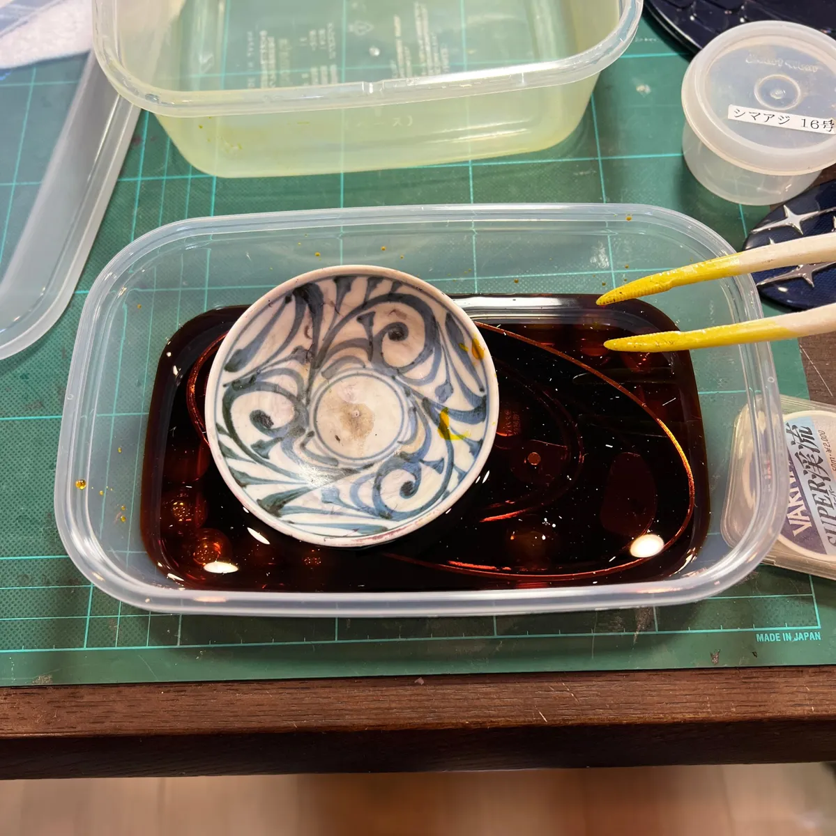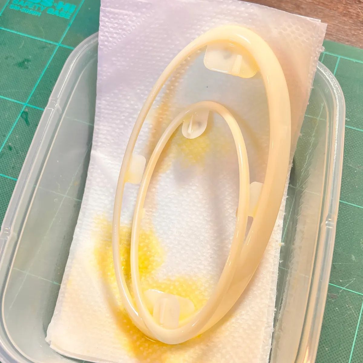 ちょうどよい大きさの容器でもエンブレムは浸りきらないので、