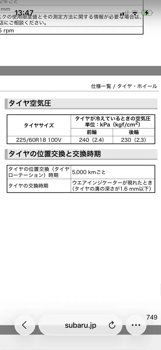 僕のアウトバックは225/60r18 104V XL のダンロップ シンクロウェザーを履いています。空気圧は冷間時前285後275で調整してます。なお吊るしの純正タイヤは225/60r18 100Vで、適正空気圧は冷間時前240後230です。タイヤの空気圧について以下ツラツラと。