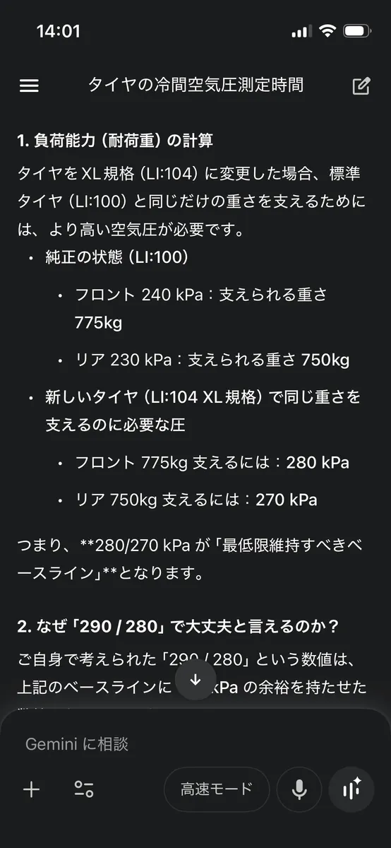 とか言いつつ、計算方法は難しくなく、2つの規格の耐荷重kgを出した耐荷重指数×空気圧のマトリクスが公にされてるので、その2つのマトリクスを見比べて適正空気圧を割り出せばいいだけです。ちょっと面倒な場合は、天下のGemini様にお伺いすれば3秒で答えてくれます笑