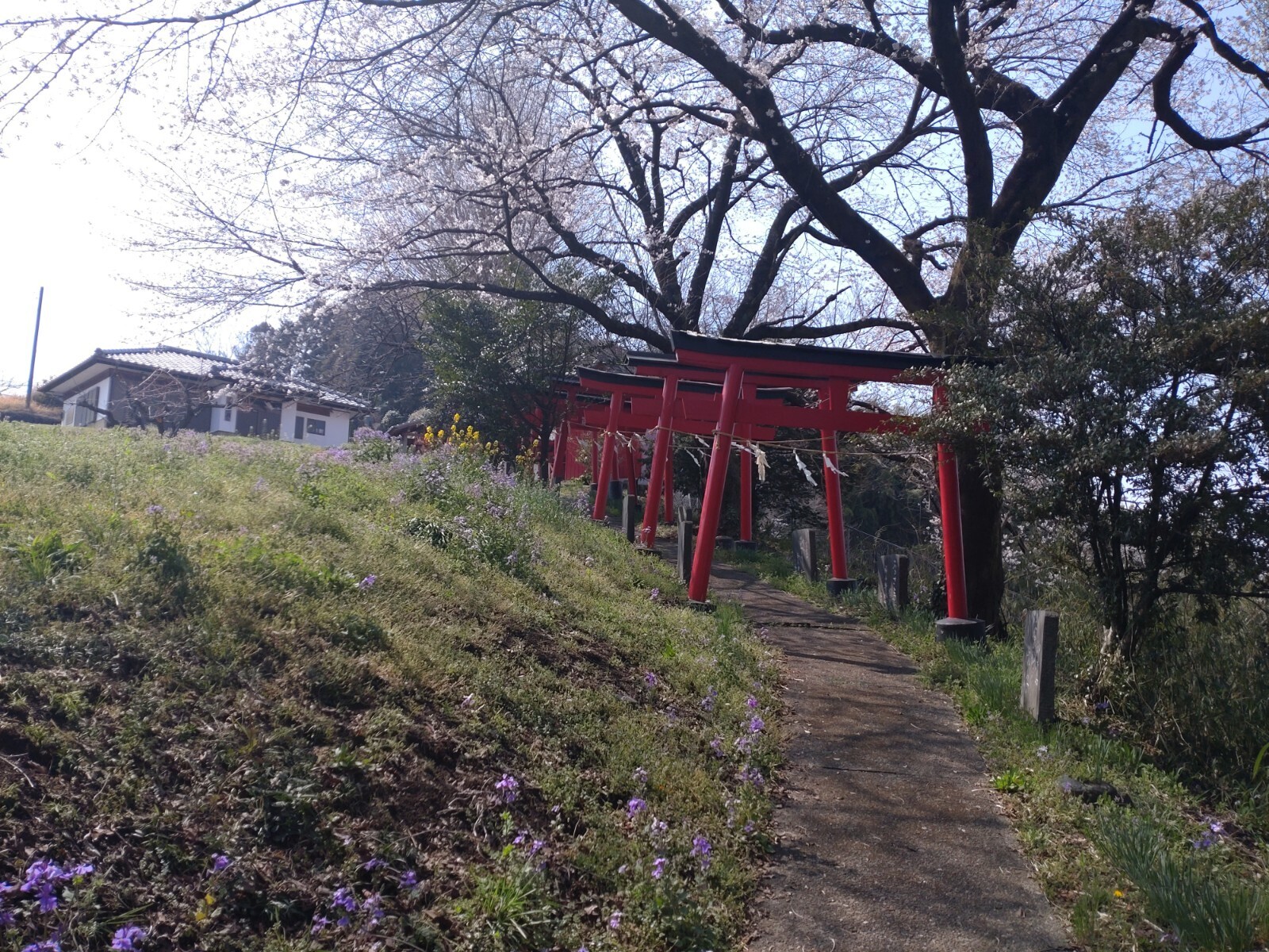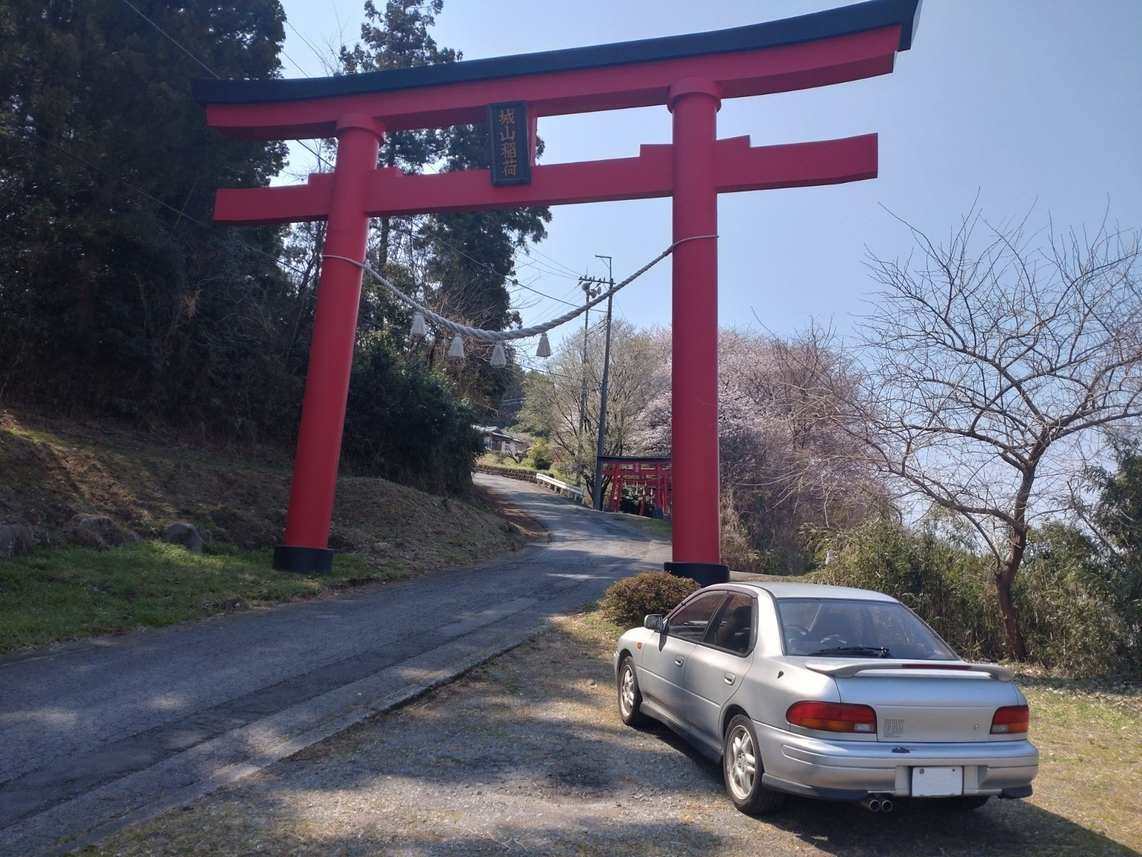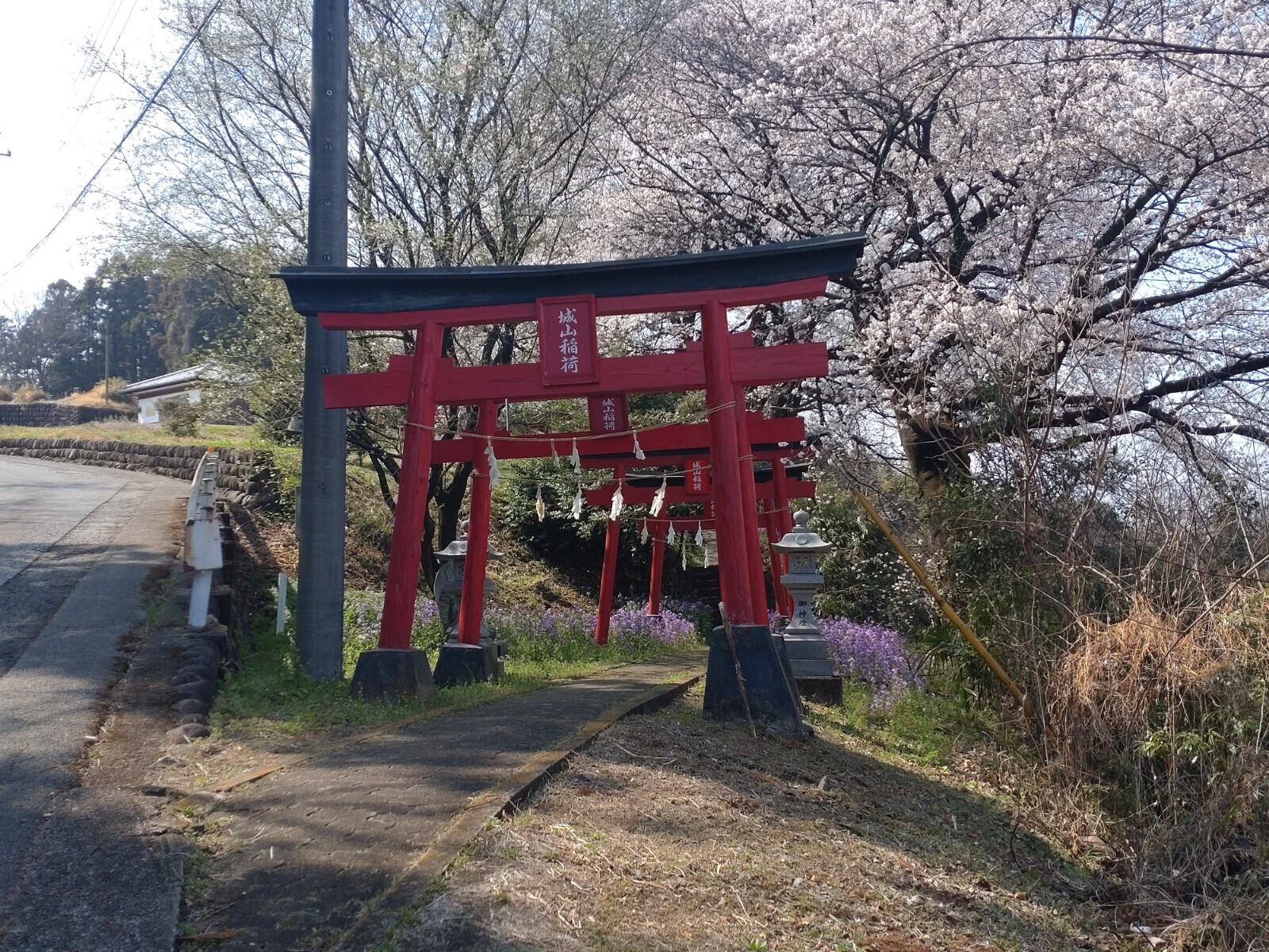 高崎市街地から榛名神社に向かう国道406号線を走っていると、下里見の交差点辺りの左の山肌に赤い鳥居と満開の桜並木が見えました。