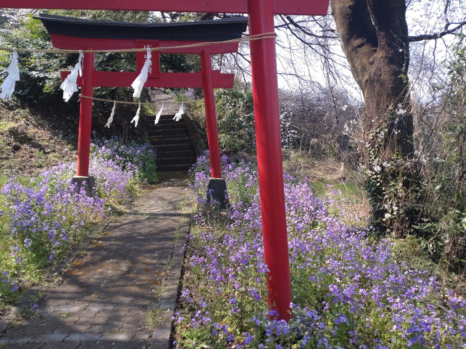 ピンクの桜と紫の花、紅い鳥居のコントラストがとても鮮やかです。
