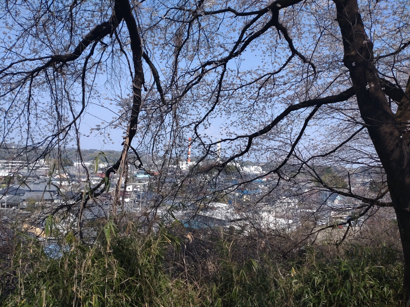 右手を見ると、桜の向こうに烏川を挟んで対岸にある高崎市高浜クリーンセンターが見えます。