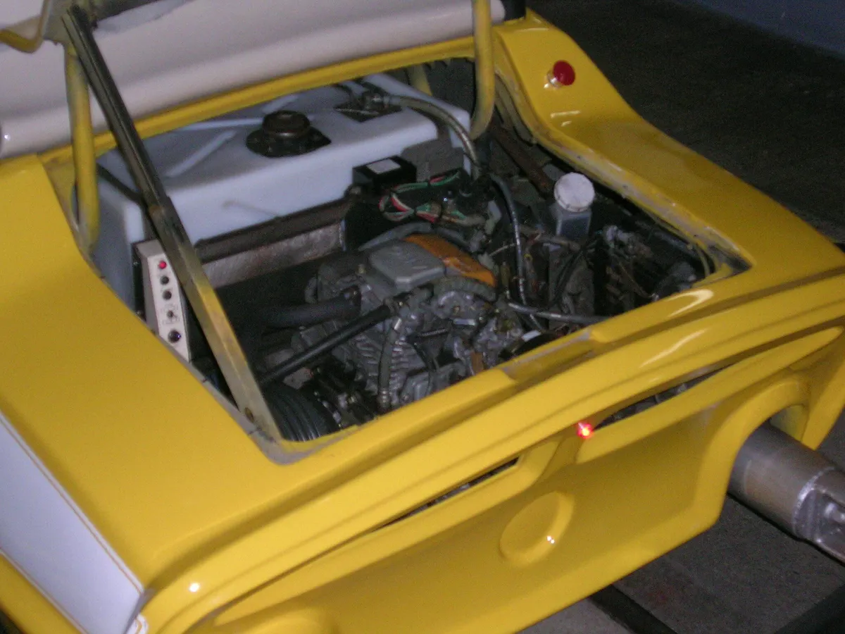 このカッコイイクルマ、迫力あるエンジン音と振動、ニオイがたまりませんでしたが、搭載されていたのは入口に飾っていたV8エンジン(笑)ではなく、空冷単気筒の汎用エンジンでした