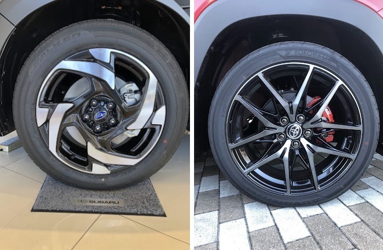 クロストレックは225/55R18のオールシーズンタイヤを、カローラクロスは225/45R19のヨコハマ・アドバンフレバを履いていました。私が乗っているインプレッサは16インチなので、どちらも大きく感じました😅