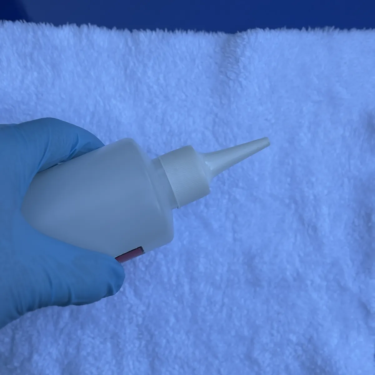 少し水分(精製水)を含ませたクロスに2、3本線を引くように塗布、もみもみしてクロス全体に染み込ませます。