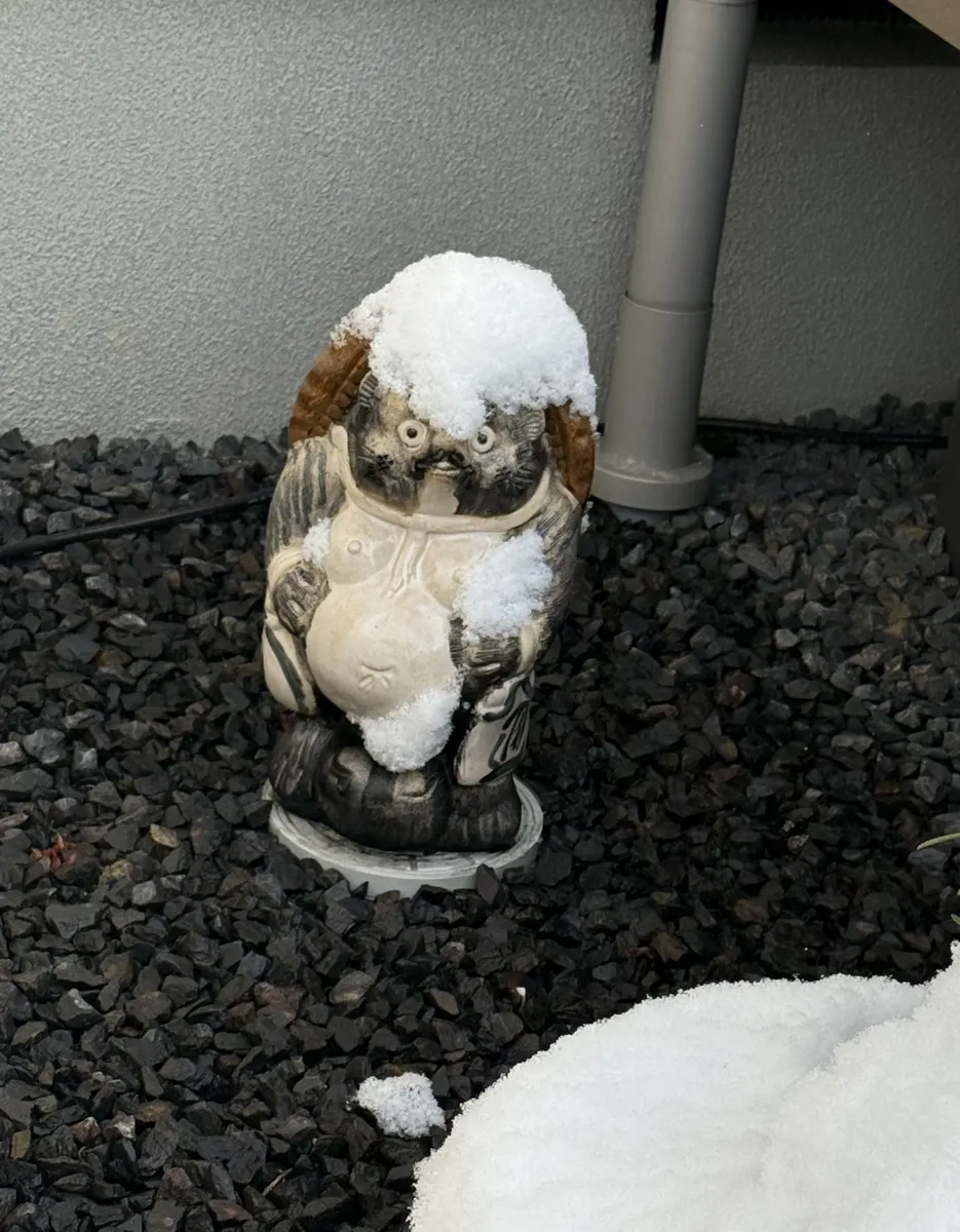 狸の置物も雪化粧です