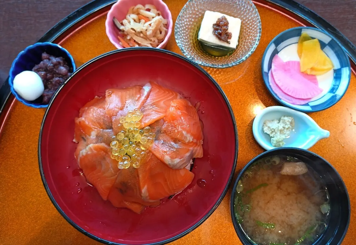 昼食はあまご茶屋で紅姫あまごの漬け丼。紅姫あまごとあまごのイクラの親子丼です。