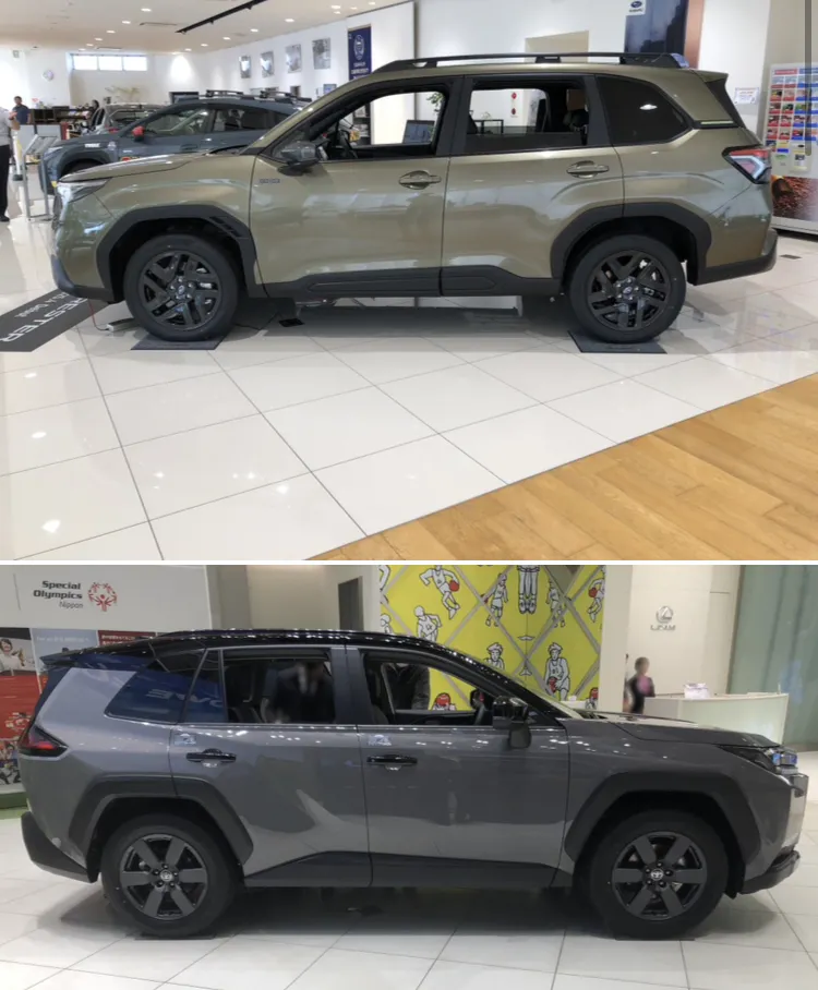 先日新型RAV4を見に行ったので、フォレスターと比較してみました‼️ 今回展示されていたグレードはAdventureでボディカラーはブラック×アーバンロック。スバルでいうところのリバーロック・パールとかつてのデザートカーキを混ぜたような色合いに見えました。フォレスターは同じくアウトドア志向のX-BREAK S:HEV EXで比較します! (一部Premium S:HEV EXの画像もあります🙏)