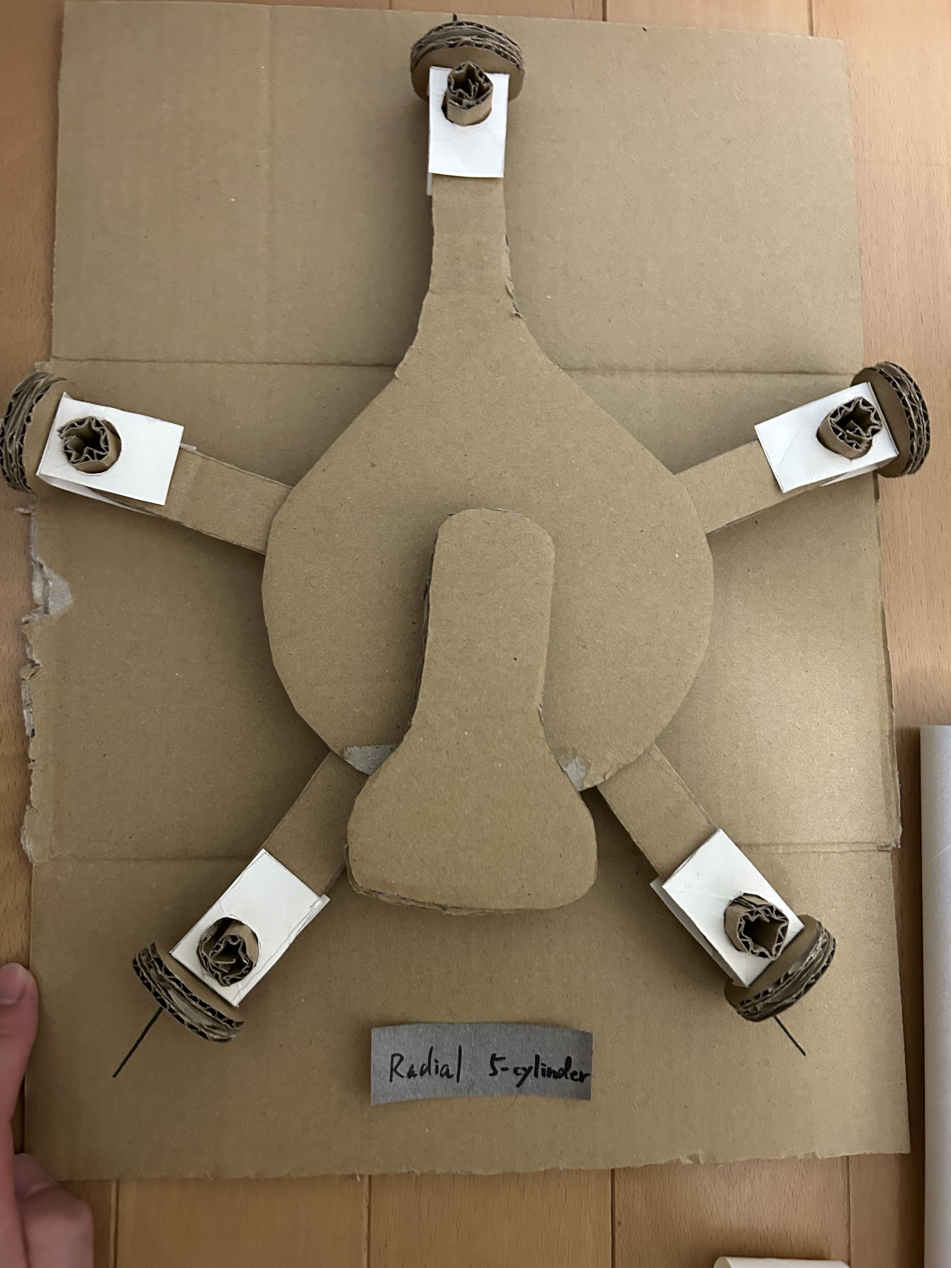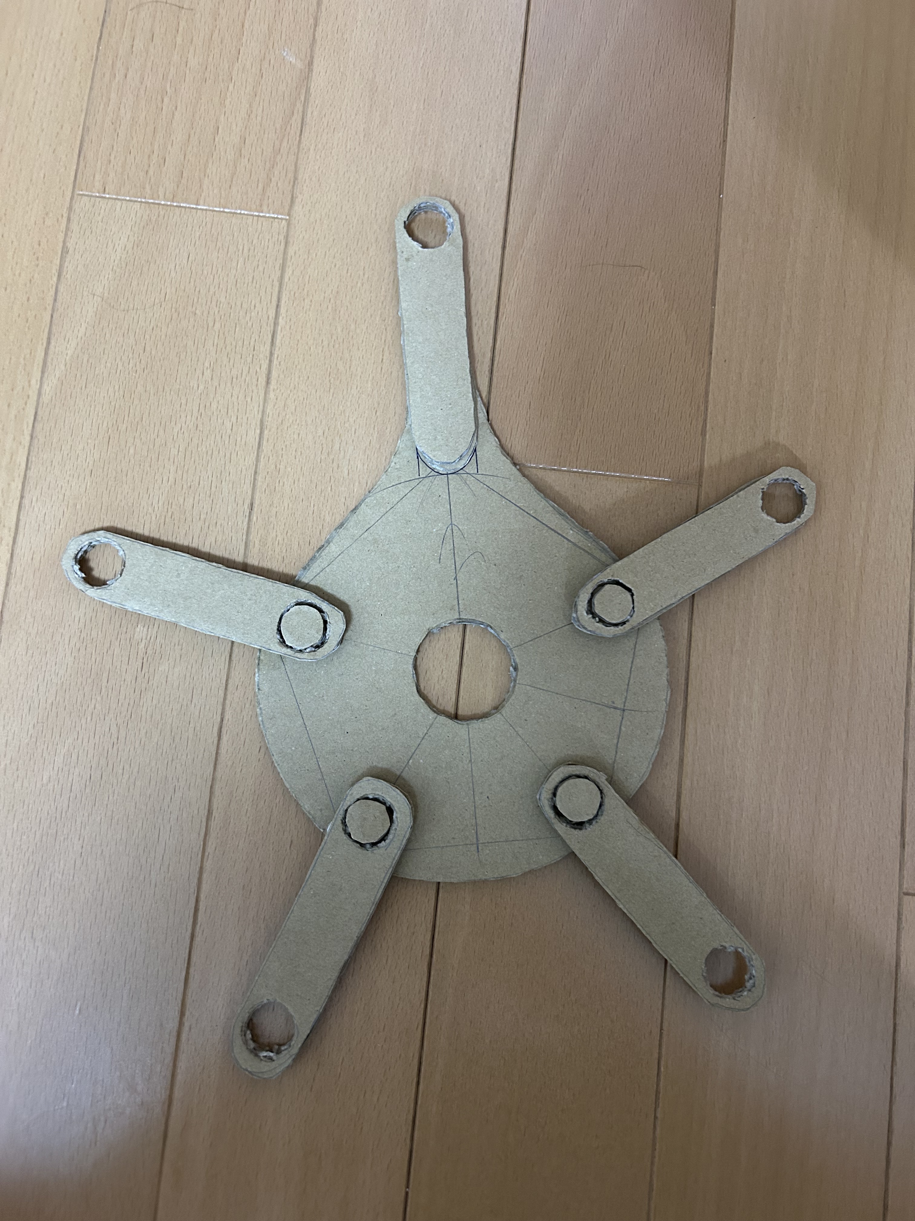 過去に星形5気筒エンジンの模型はダンボールで作りましたが、7気筒は、正七角形の作図が難しいので諦めていました。