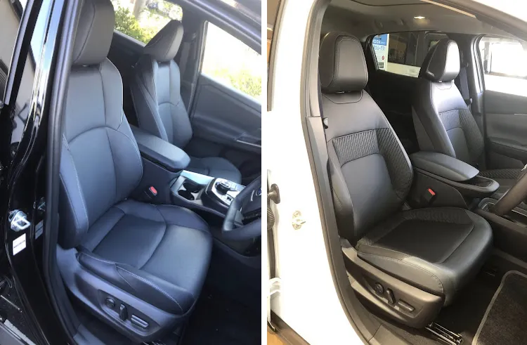 リーフは上級グレードでソルテラはエントリーグレードだったので質感ではリーフが上回るのではないかと予想していましたが、新型ソルテラでは合成皮革シートが採用されるなど、実際には互角に感じました。後席のドアとリアゲートがロックされていたので、残念ながら新型リーフの後席と荷室は見ることができませんでしたが、サイズが大きい分ソルテラがリードすると思います。