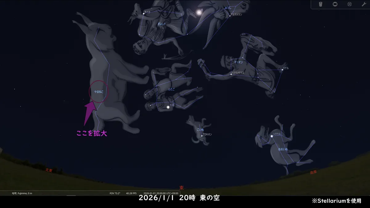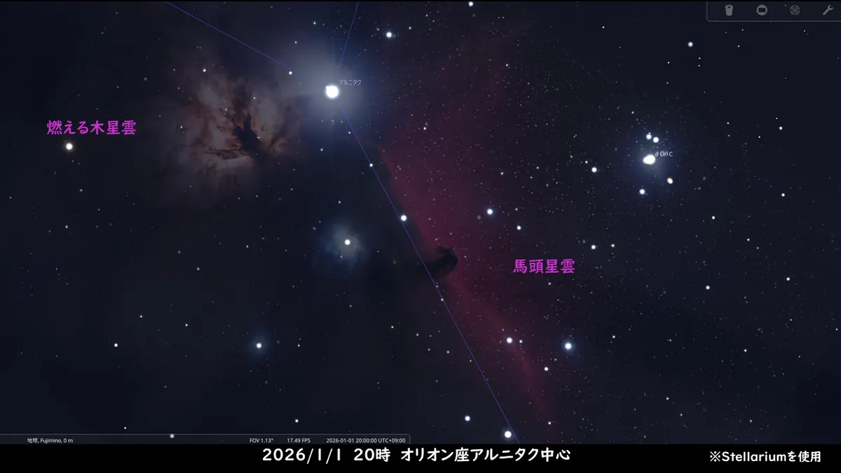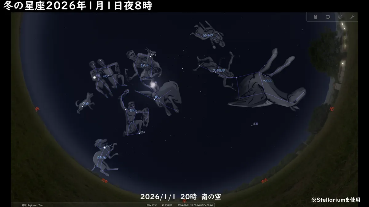 冬がやってきました⛄寒いですね。ですが冬の方が空気が乾燥して澄んでおり、星空観測には絶好の季節です🌟それでは、私なりの冬の星空探検をしてみましょう🔭今回は少し深い深宇宙の世界を楽しく紹介したいと思います。月日は、2026年1月1日夜8時を想定して紹介します。シミュレーションにはStellariumというソフトを使っています。まずはその日の夜空を紹介です👇