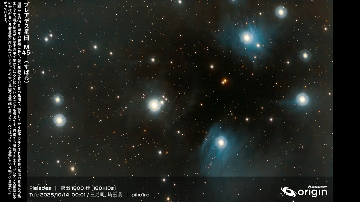 10/14に撮影したすばるです。左の二つの星は、上は母プレイオネ、下は父アトラスと呼びます。正面には、アルシオーネという星で、その右下はメローペと呼ばれ、プレアデス7姉妹の一部です。このメローペには散光星雲がありメローペ星雲と呼ばれ、よく見ていると雲のようなもので覆われている姿が見えます。また、アルシオーネは、ひときわ明るい星であることから車名アルシオーネの由来はフラグシップなモデルとして名づけられたと考えられます。この画像には写っていませんが、7姉妹でアステローペという星もあり、昔富士重工が企画したボルボ製アステローペというバスもありました。今度はオリオン座を中心に見てみましょう👇