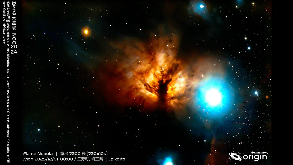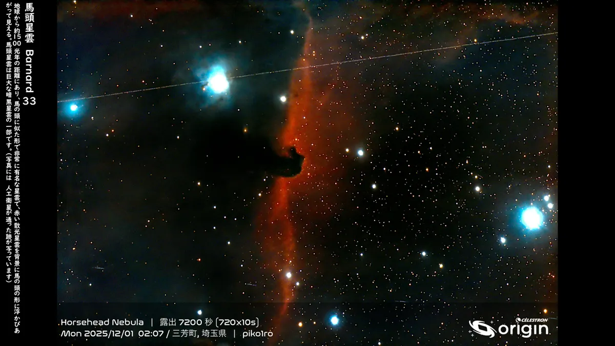 この写真は、12/1に撮影した馬頭星雲です。赤い散光星雲の中に黒い暗黒な馬の頭の姿が、馬頭星雲と言われています。非常に特徴的な形をしていますね。今度は燃える木星雲を見てみましょう👇