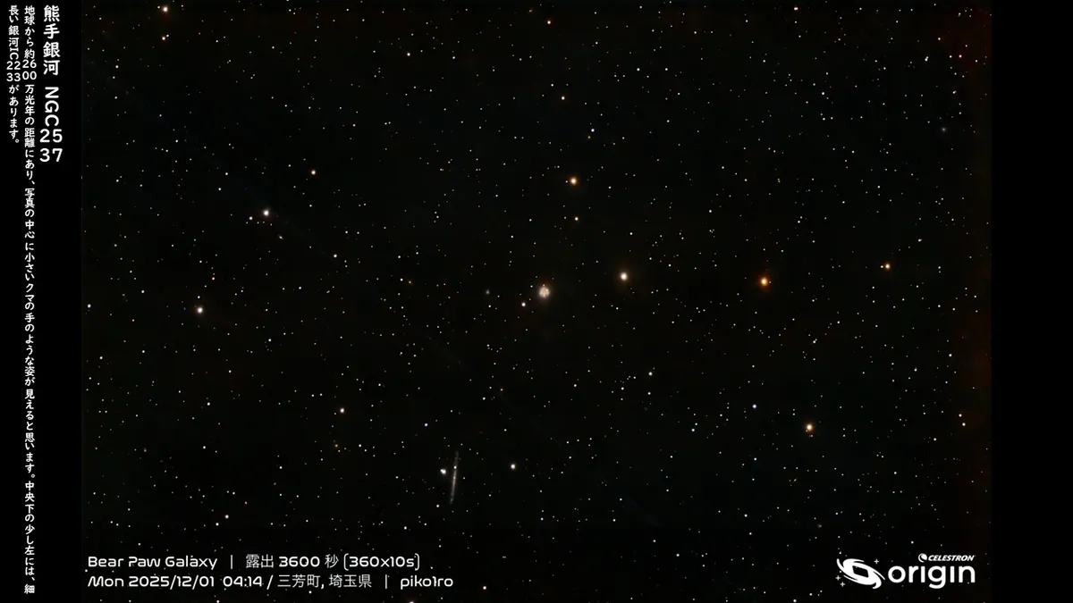 東の空には、ふたご座よりも北東側にやまねこ座という星座があります。そのおなかの部分に熊手銀河があります。非常に小さいですが、撮影に成功しましたので見てみましょう👇