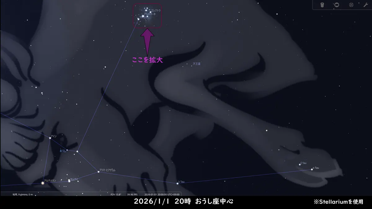 左下に赤星のアルデバラン、上にプレアデス星団(すばる)があります。この左下にあるアルデバランは、Y字の星団にあり、別名ヒアデス星団と呼ばれています。このヒアデス星団は、鐘の形状をしていることから、鐘星や釣鐘星と呼ばれております。そして、赤星のアルデバランは、すばるよりも後から登ってくることから、アルデバランは、すばるの尾の星と呼ばれています。それではすばるを見てみましょう👇