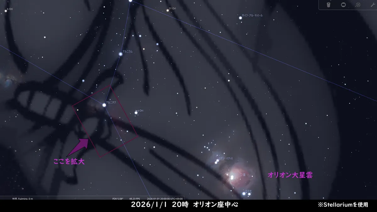 アルニタク、アルニラムを拡大しました。三ッ星の下にはオリオン大星雲が見えます。とても大きく大変分かりやすいです。望遠鏡で見ると白い雲のように見えます。アルニタクを拡大する前に、オリオン大星雲を見てみましょう👇