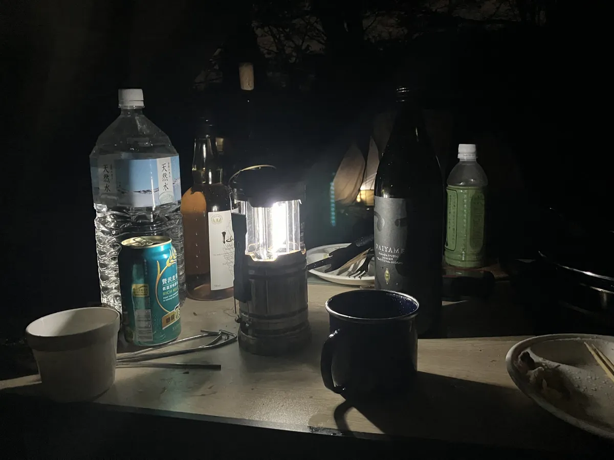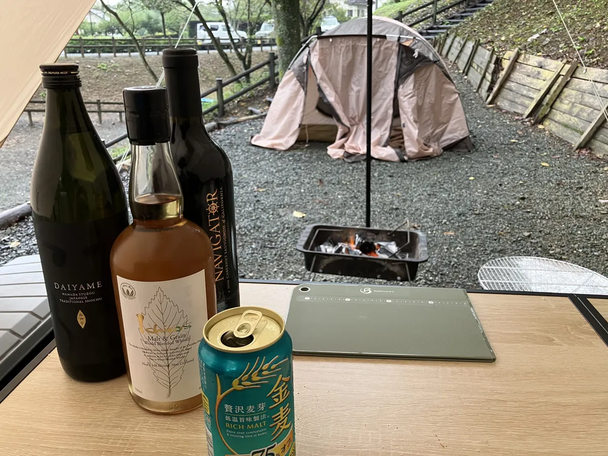 ▼設営完了したので、雨の中、一杯やります