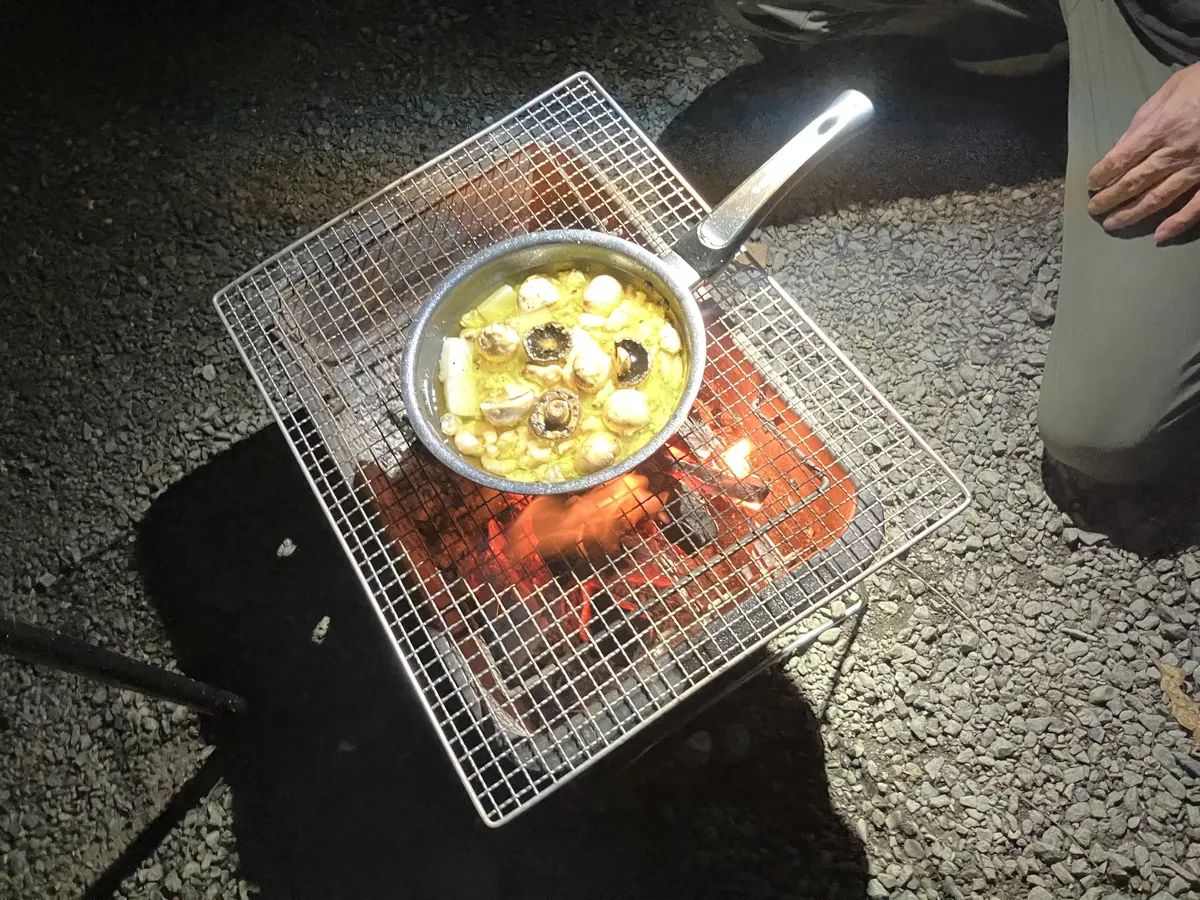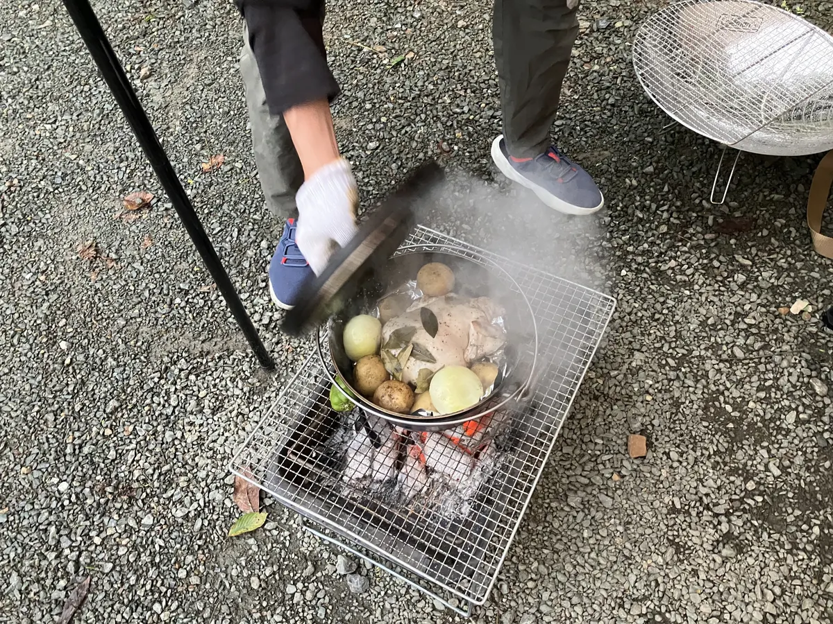 仲間がダッジオーブンで鳥を丸ごと蒸してくれました❣️