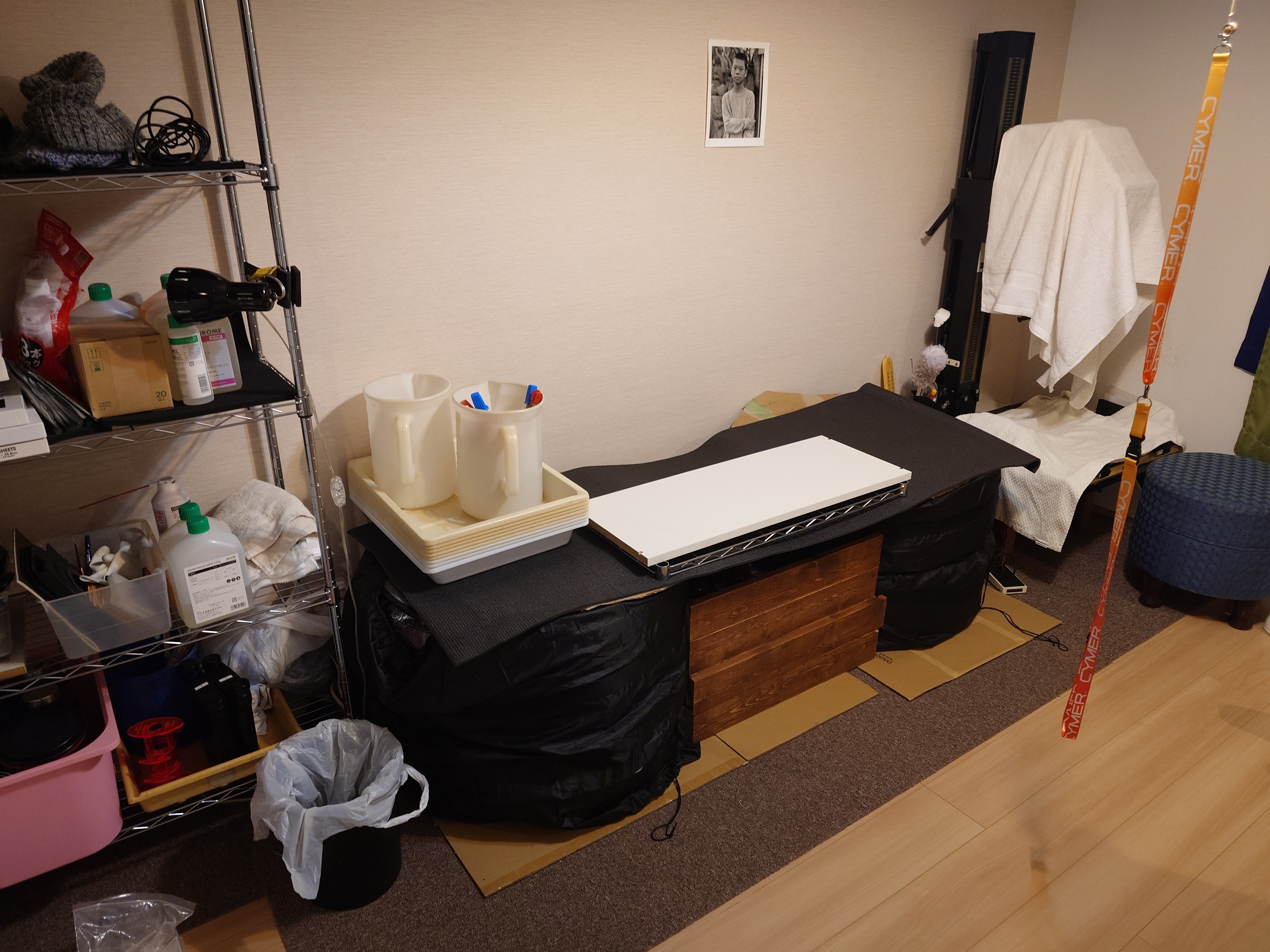 トップ > 写真部 > スタッドレスタイヤ保管の有効活用 tosha 2026/03/23 13:17 スタッドレスタイヤ保管の有効活用 スタッドレスタイヤの保管問題を、暗室のワークベンチ化で解決。 タイヤの横置き(平積み)スペースをそのまま土台にし、メタルラックの棚板を渡して4連バットの作業台を構築しました。 タイヤの安定感と重さを活かした低重心な設計。見栄えと作業性を考え、次は合板を敷いて仕上げる予定。正に一挙両得な秘密基地化です。 まあ、暗室を持ってる人がこの世の中にどれだけいるのかっていう疑問があるのですが。 暗室 スタッドレス いいね 共有する 共有する X facebook LINE リンクをコピー コメントする 0 件の返信 (新着順)