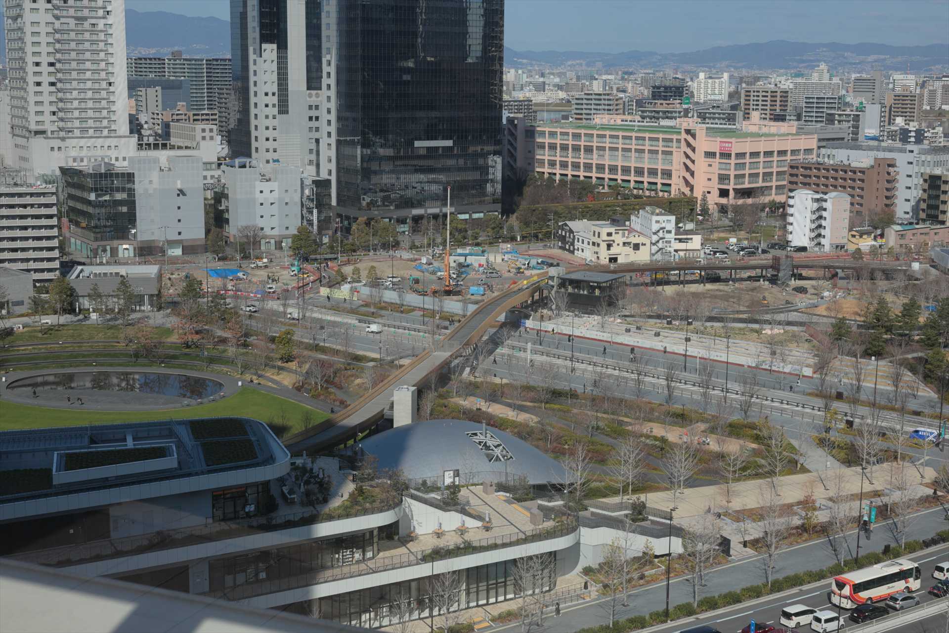 4. 大阪市が都会に緑をということでつくってるグラングリーン大阪が見下ろせます。エリア全体の約7割が完成し、2027年春頃のうめきた公園全体(ノースパーク含む)の完成を目指し、現在も開発が進行中です。