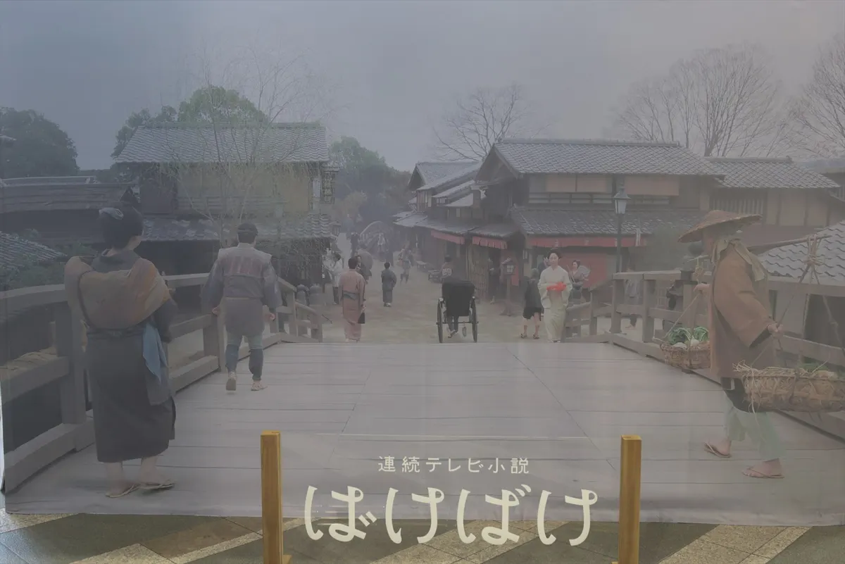 01. 『ばけばけ』の舞台となる、明治時代の松江の街並みを再現した巨大フォトスポット。背景幕の前で撮影すれば、ドラマの世界に迷い込んだような1枚に。