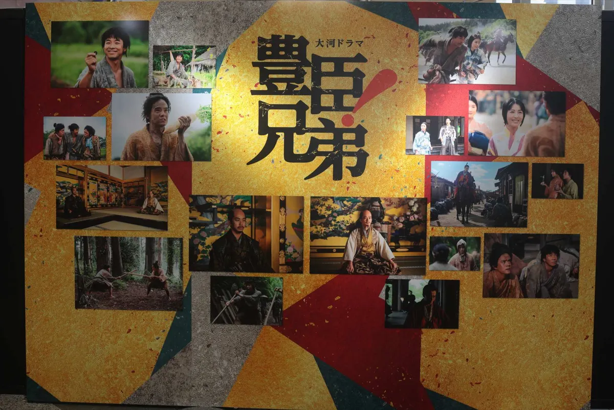 16. 『豊臣兄弟!』のパネル展示。ドラマの主要シーンや登場人物たちの表情を捉えた写真がコラージュされ、秀長が支える豊臣家の躍進を予感させます。