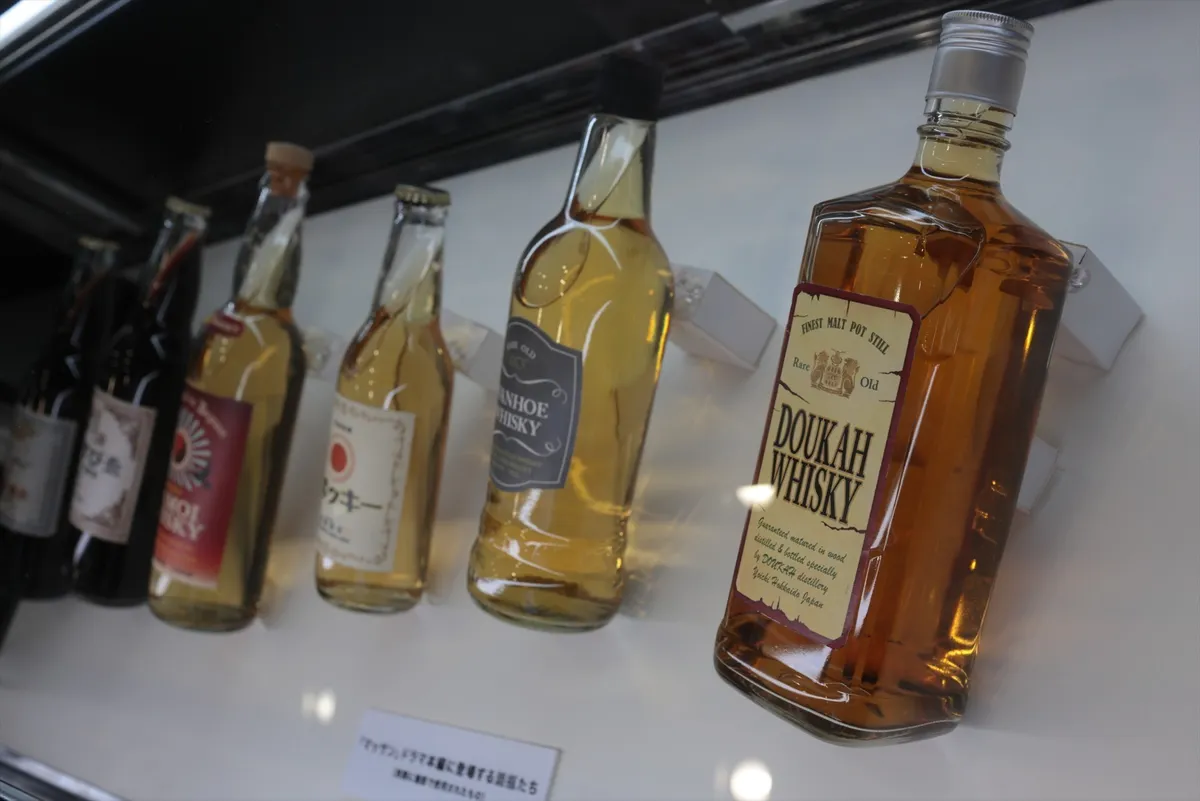 12. 『マッサン』の劇中に登場したウイスキーボトルの数々。「DOUKAH WHISKY」など、ドラマのために制作されたこだわりの小道具を間近で見ることができます。