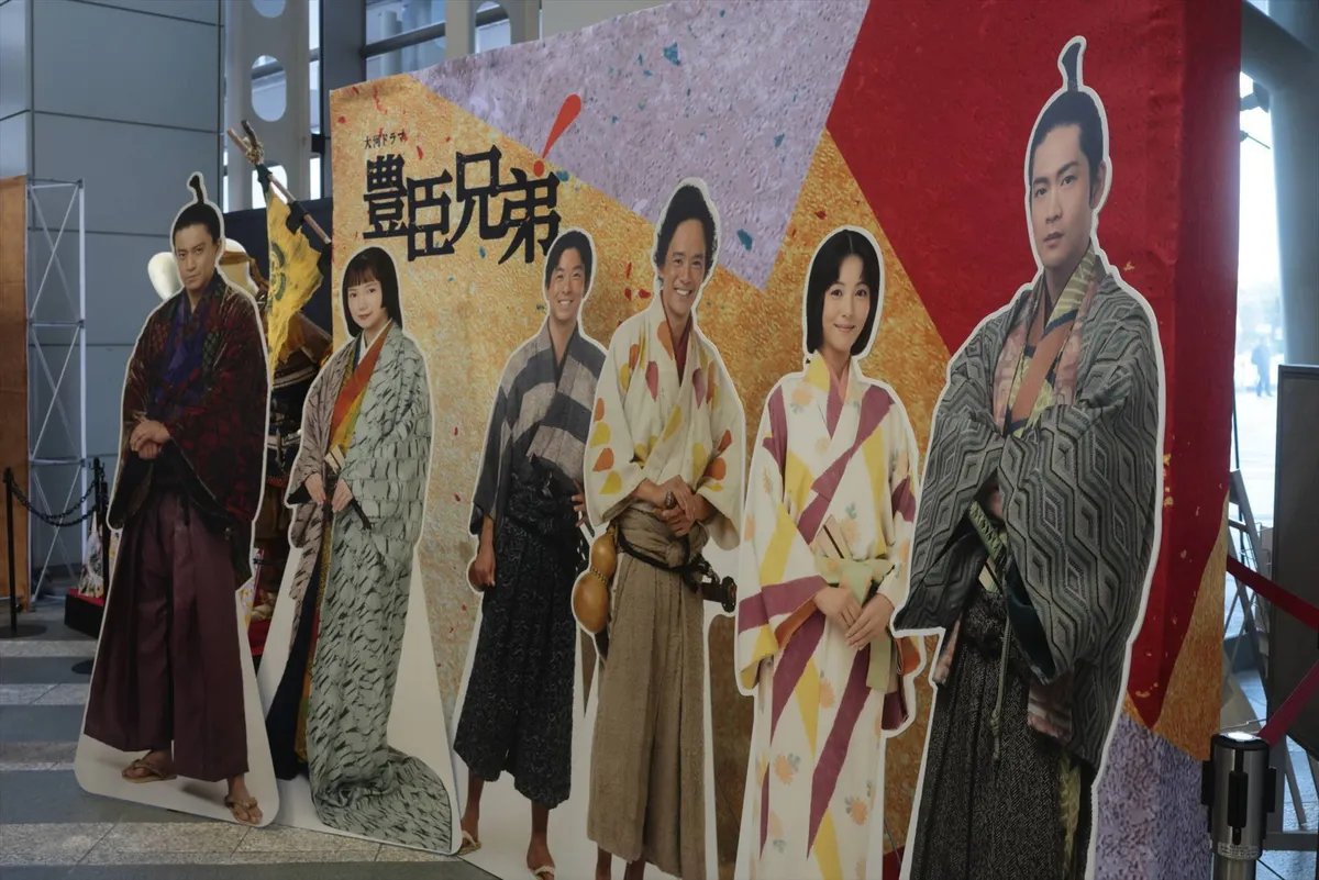 14. 『豊臣兄弟!』主要キャストの等身大パネル。仲野太賀さん、池松壮亮さん、浜辺美波さん、小栗旬さん、松下洸平さん、宮﨑あおいさんと、豪華な顔ぶれが並ぶフォトスポットです。