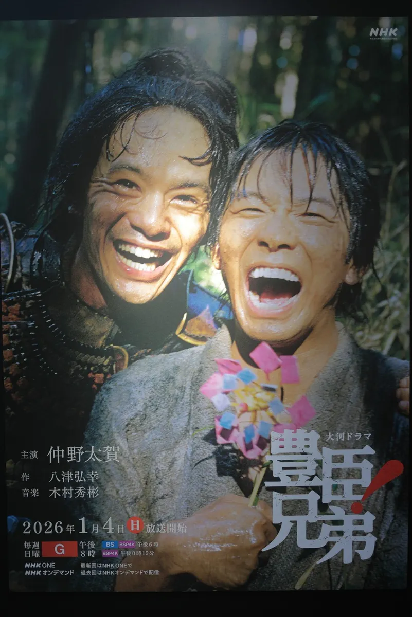 13. 2026年大河ドラマ『豊臣兄弟!』の先行ポスター。主演の中野太賀さん(豊臣秀長役)を中心に、戦国時代を生き抜く兄弟のエネルギー溢れる笑顔が眩しい一枚。