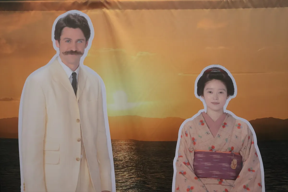 03. 『ばけばけ』の等身大パネル。小泉八雲(ラフカディオ・ハーン)をモデルとしたレフカダ・ヘブン(トミー・バストウさん)と、その妻セツをモデルとしたトキ(高石あかりさん)の二人が、宍道湖の夕日を背に並ぶ印象的なビジュアル。