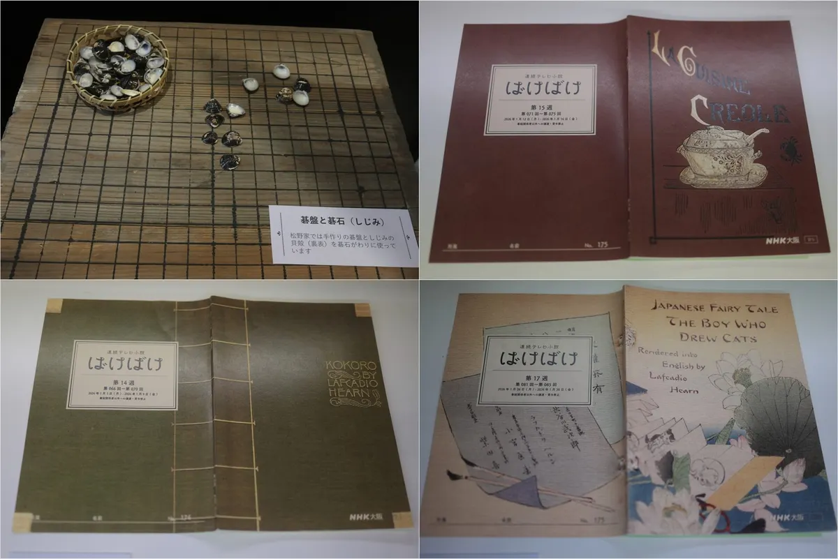 07. 『ばけばけ』の台本と特徴的な小道具。松野家で使われている「しじみの貝殻を石代わりにした囲碁セット」や、第14週・15週・17週の台本が並び、物語の進行を肌で感じられます。