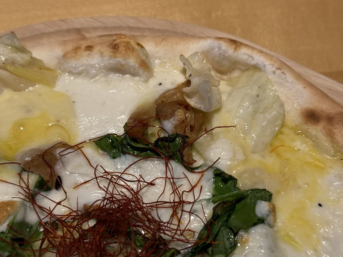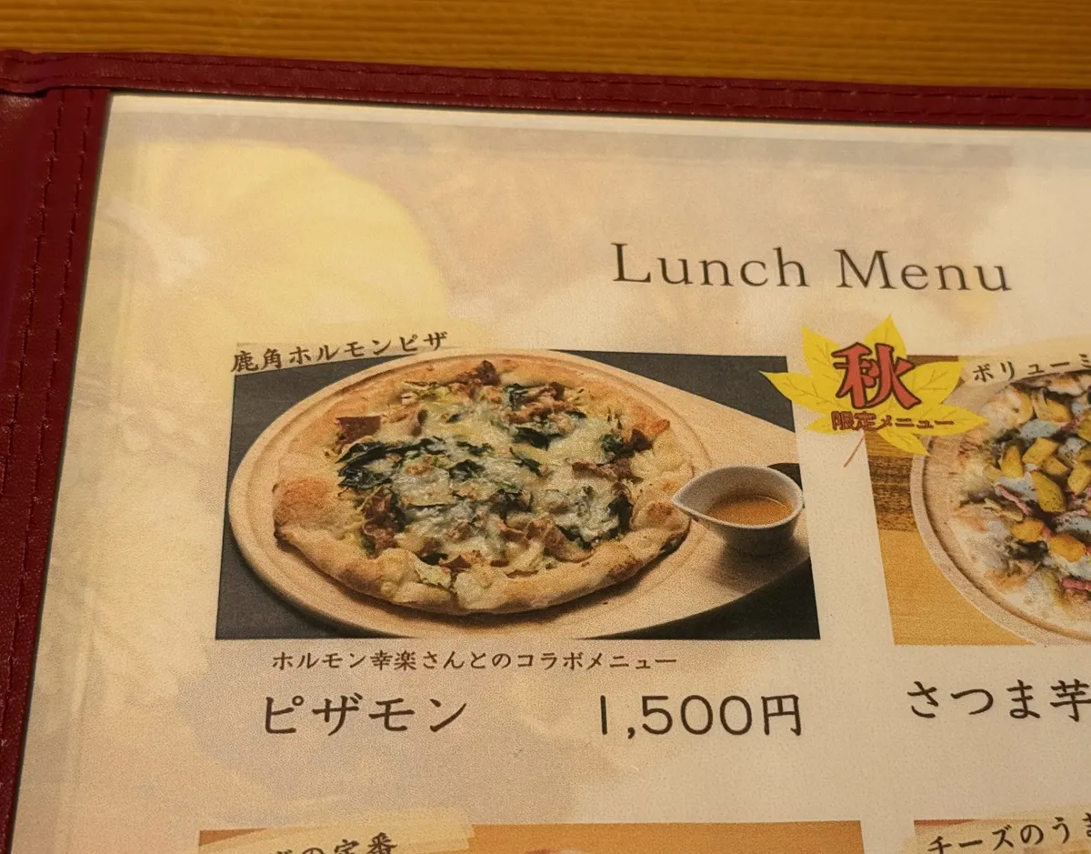 この地域で有名なホルモン幸楽のホルモンやそれに合わせて長ネギやキャベツがトッピングされたピザです。