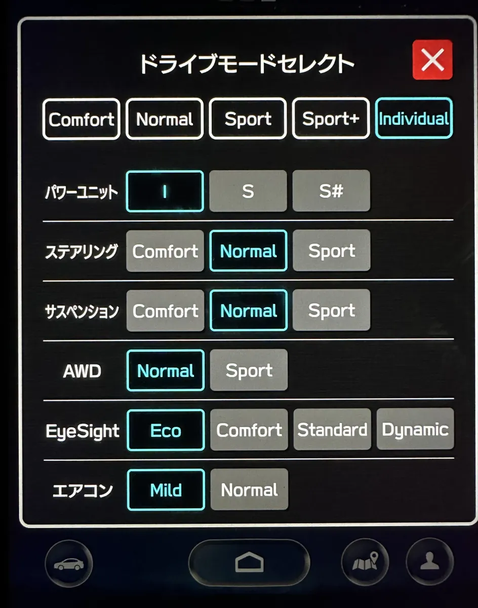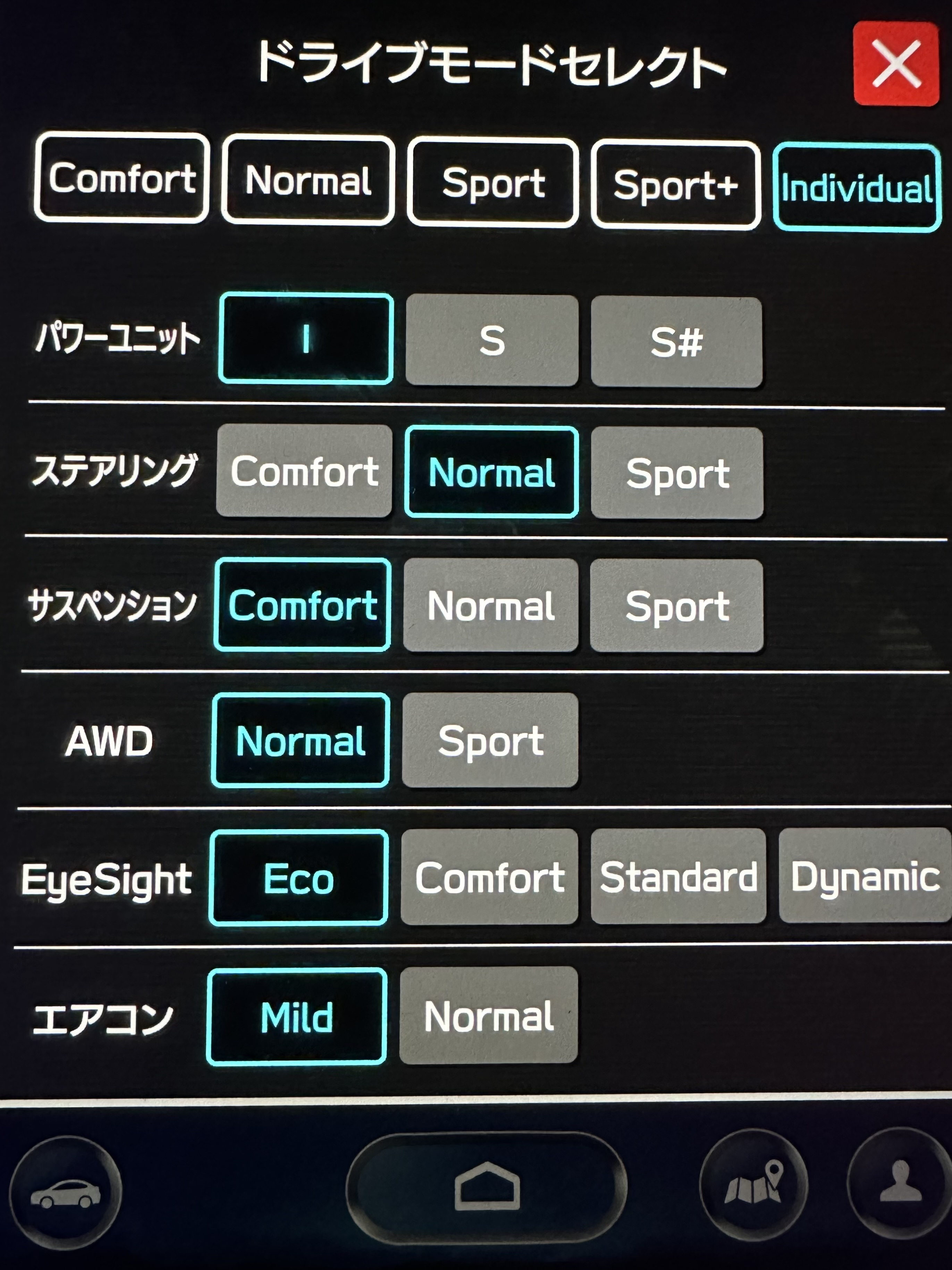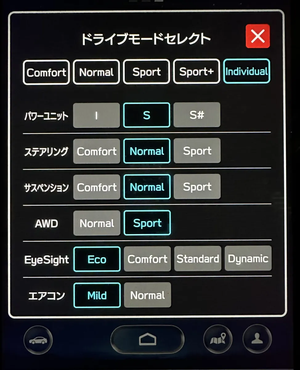今は individualモードは ステアリングのみ スポーツで設定。家内を乗せるとすぐ★を押しますよー