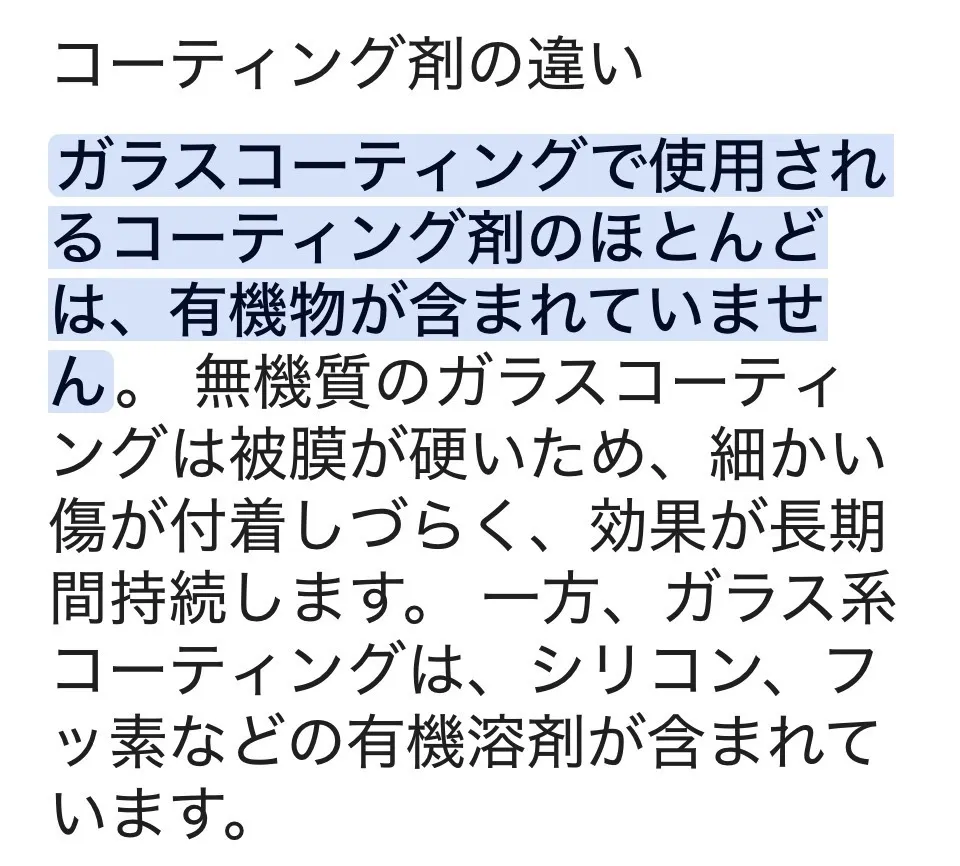 そうなんですよ。ガラスコーティング剤は、有機物含まれていないんですが、ガラス系は、含まれるんです。で、Pro staffさんは、