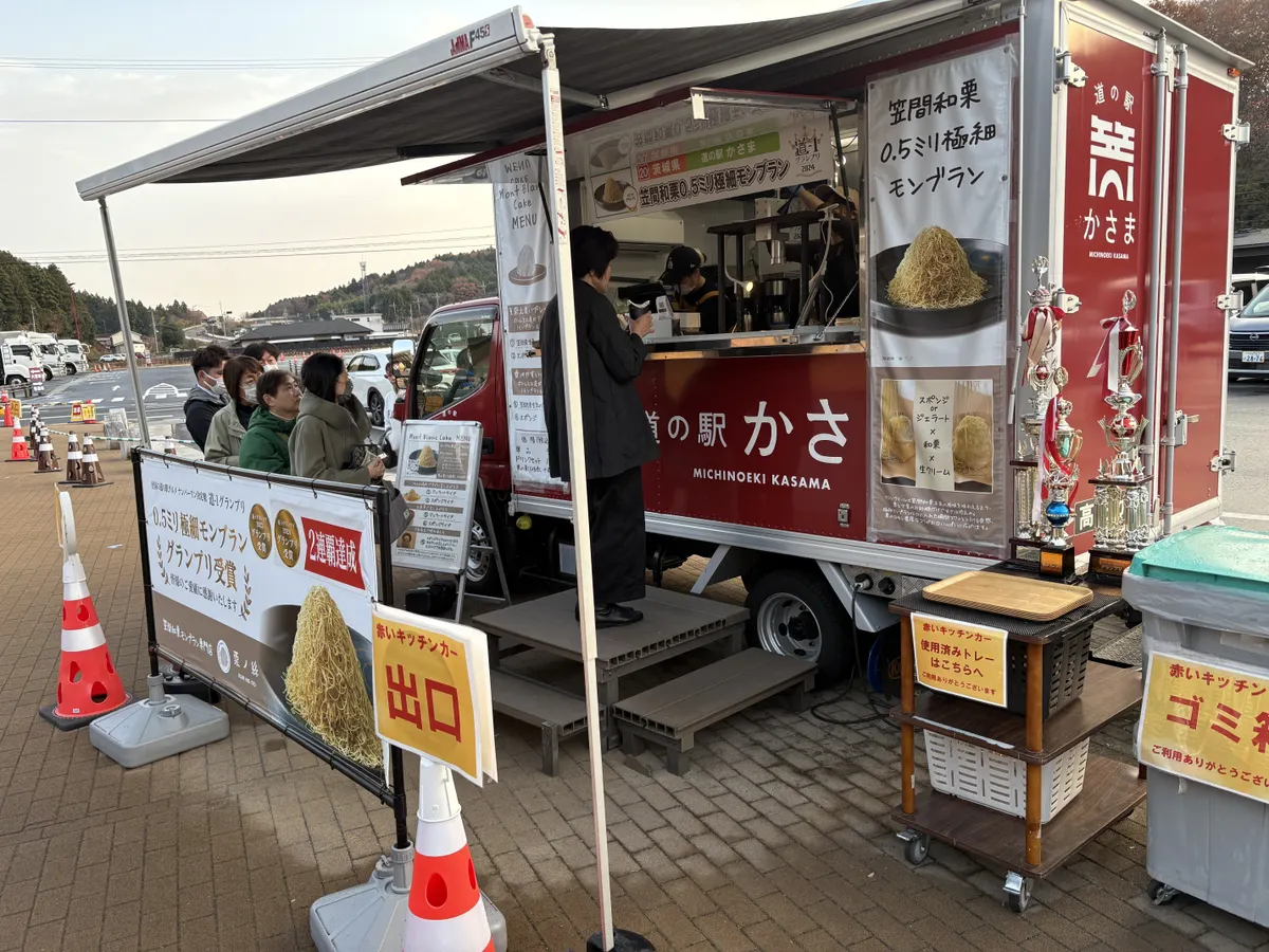 ランチの後は勿論デザートですよね〜🤔?レストランの外に、極細0.5mmの笠間和栗のモンブランを販売するキッチンカーに、平日なのに長蛇の列😱。それでも、折角来たので列に並びました。