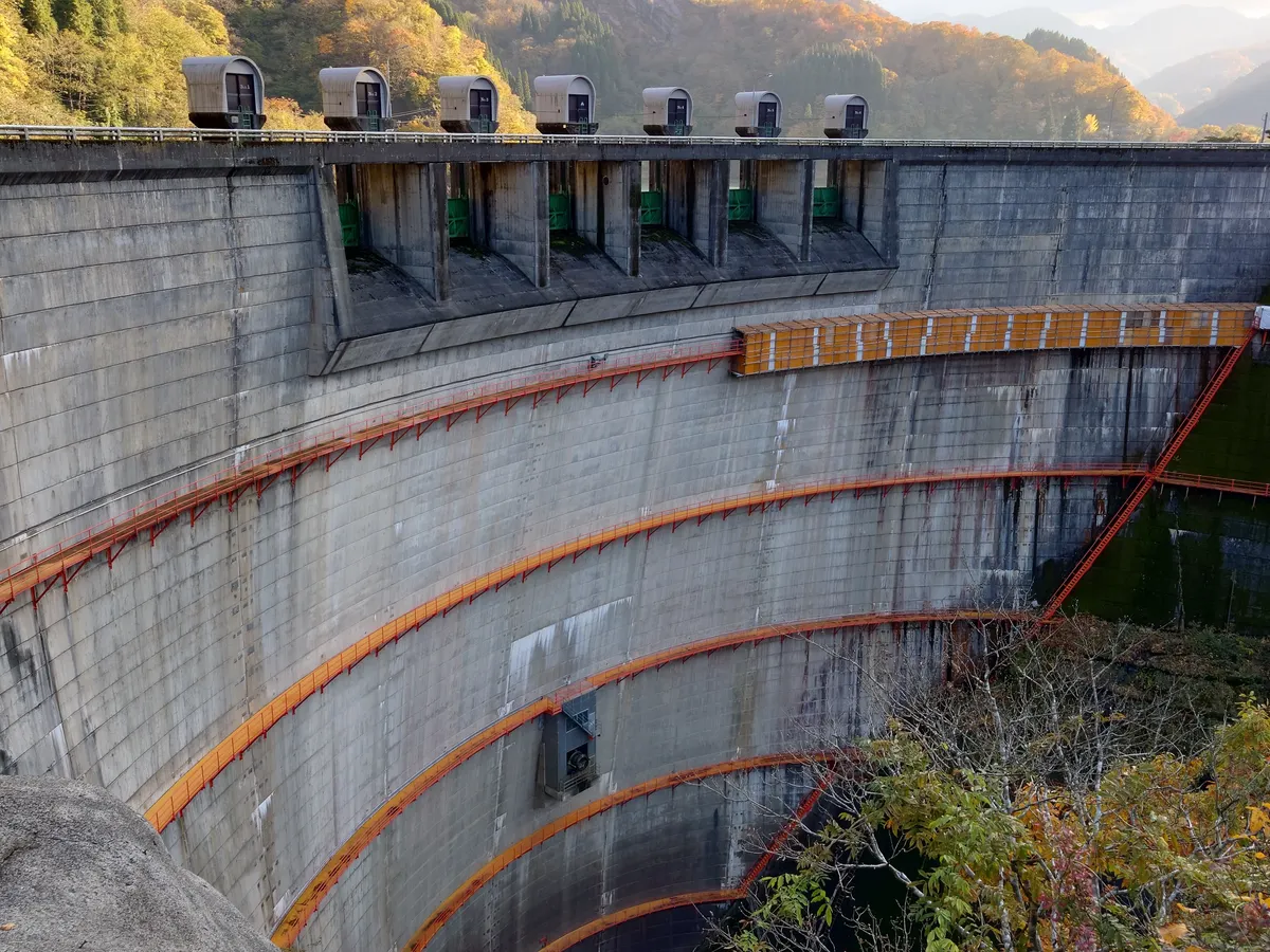 刀利ダムはアーチダムですが、一部重力式コンクリートダムを採用しており、黒四ダムと雰囲気が似てますね。天端が湾曲していて不思議な感じ。