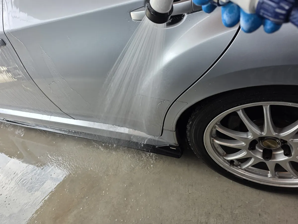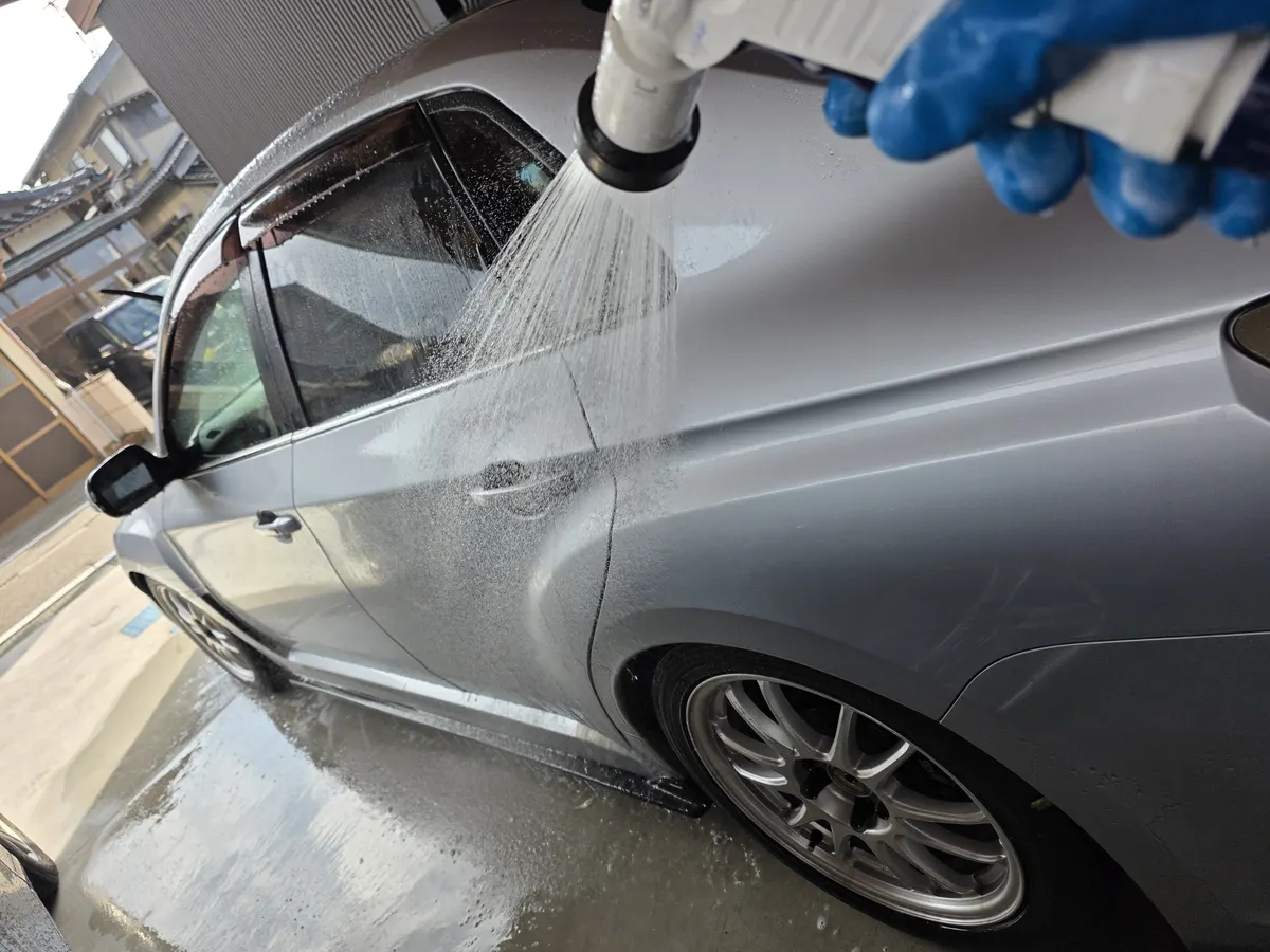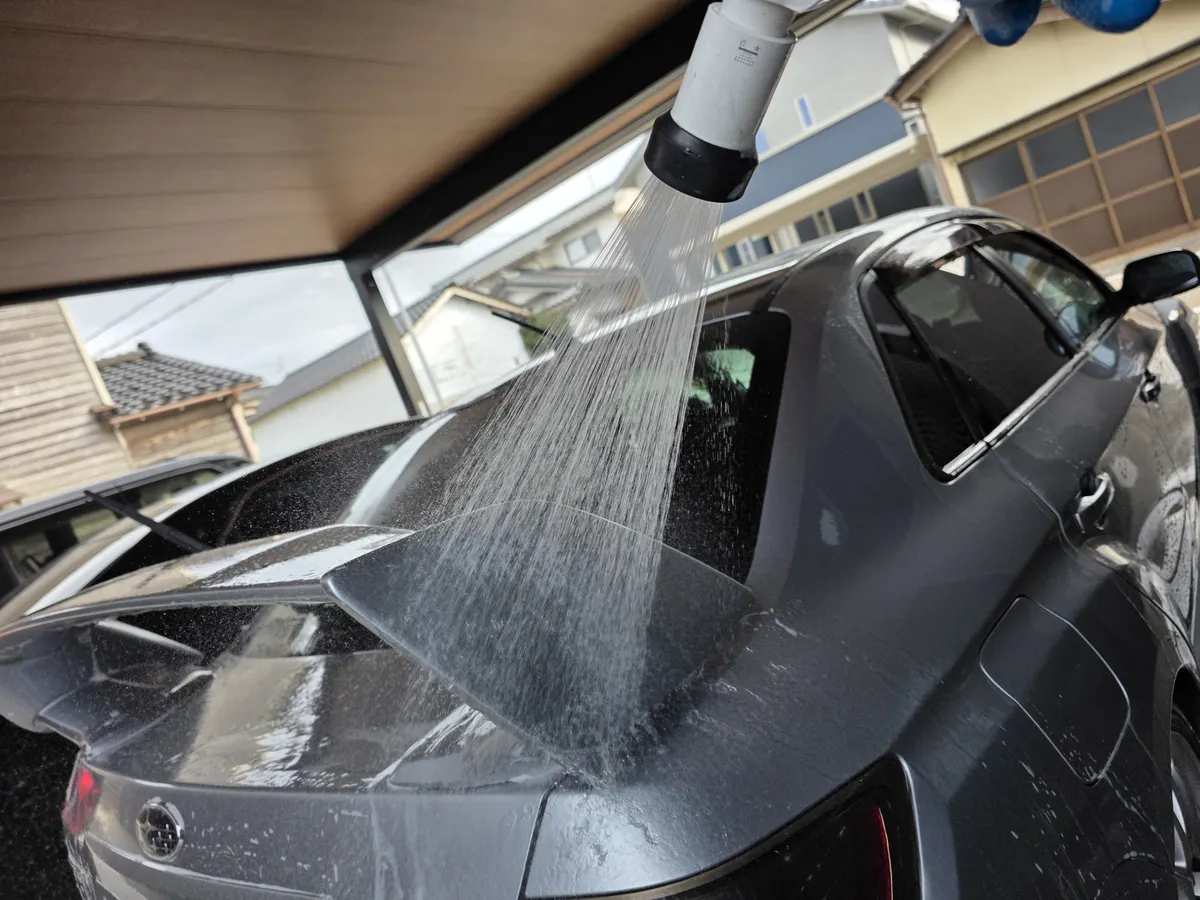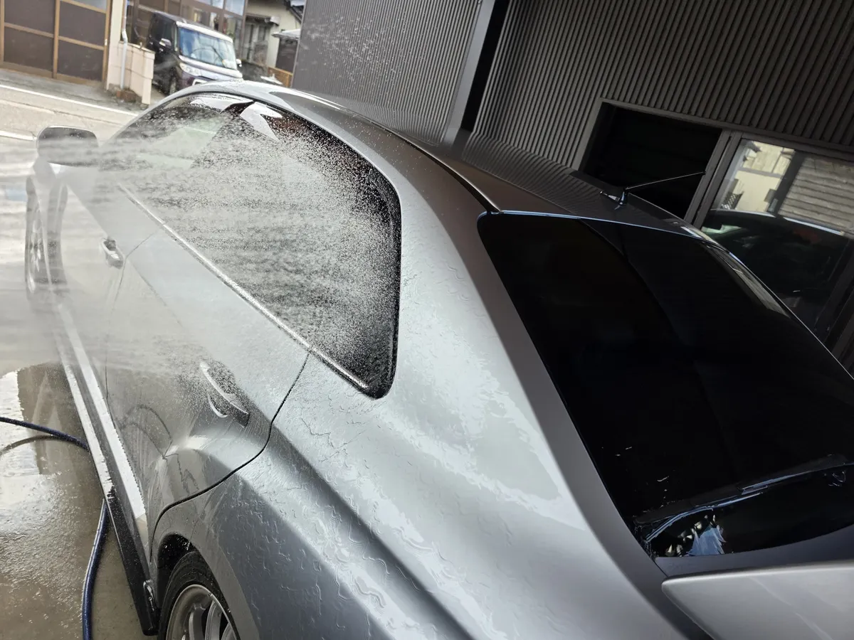 次にガラスコンパウンドの濯ぎを兼ねて全面シャンプー洗車へ。